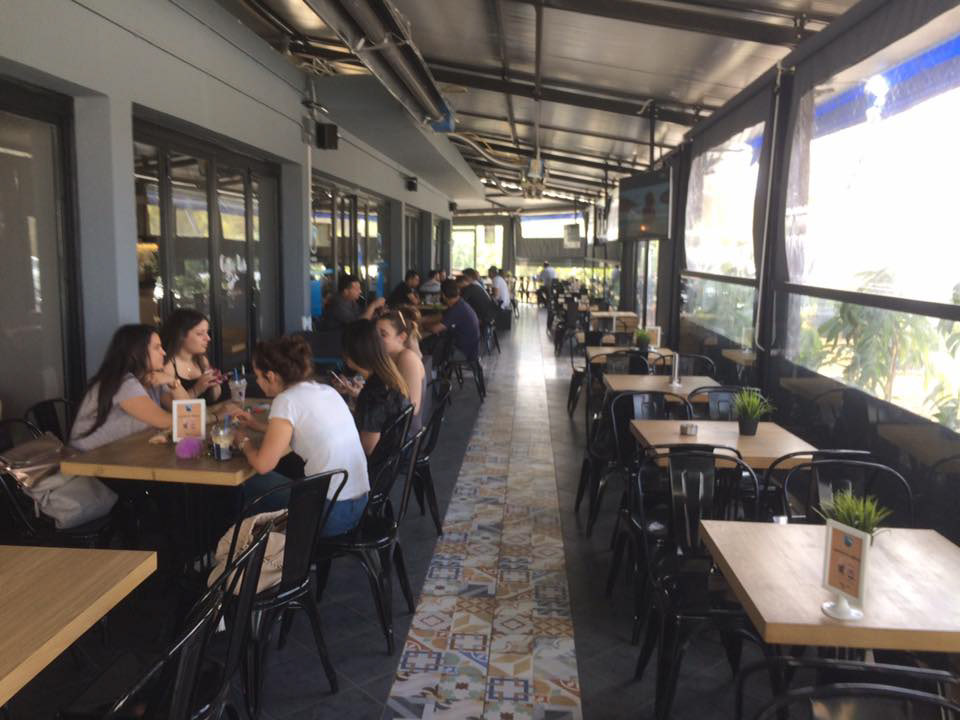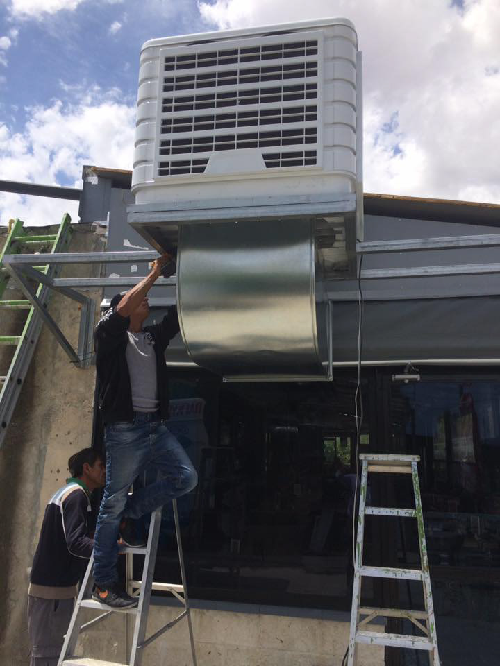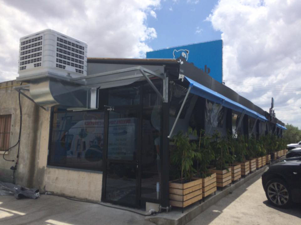 Cafeteria outdoor covered sitting patio concealed cooling installation