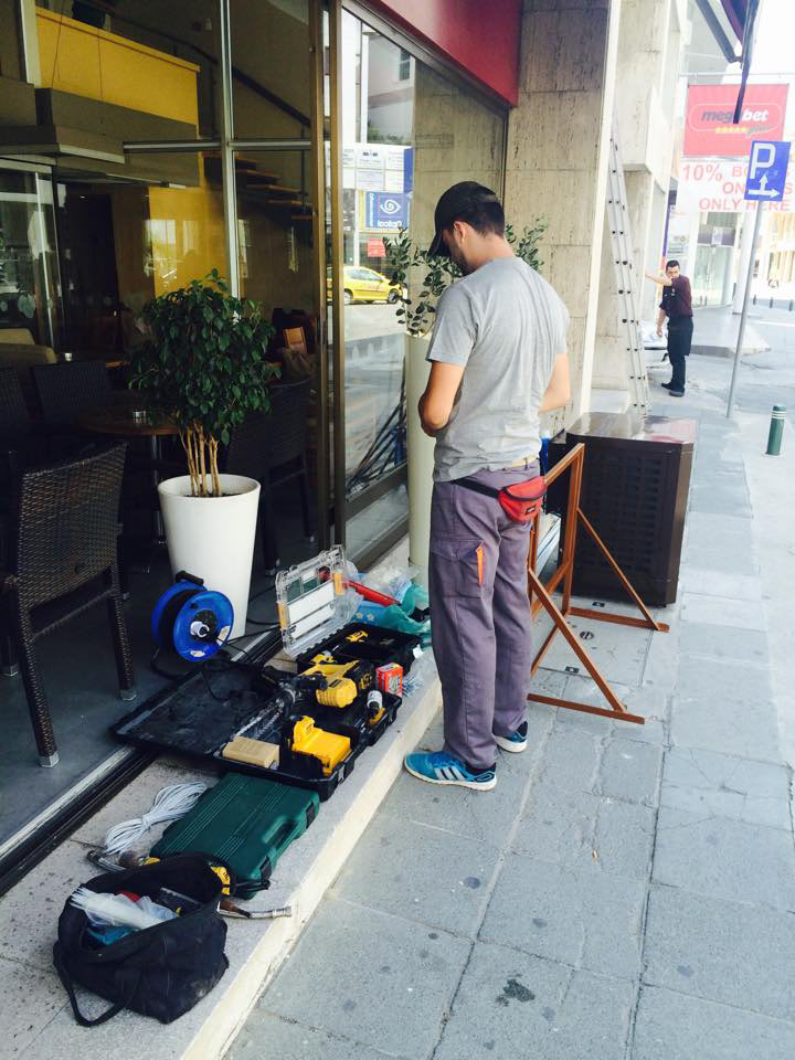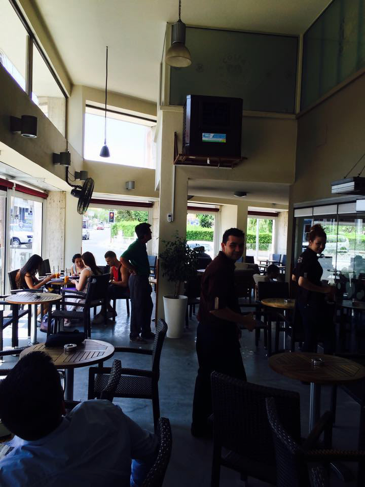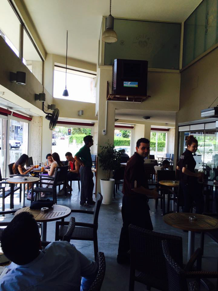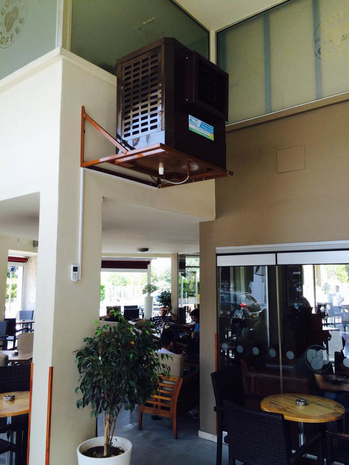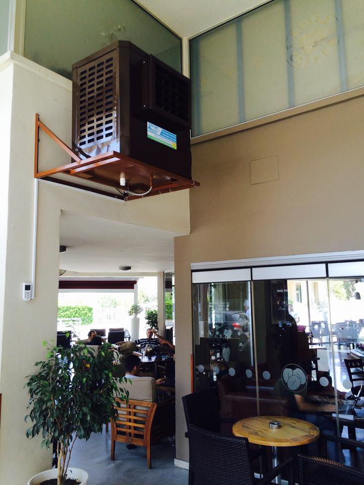 PROJECT: Cafeteria's semi opened sitting area cooling solution CUSTOMER: Requested a save energy cooling solution to operate with open doors and windows. SOLUTION: Installation one 9,000 CFM aircooler with humidity and temperature control.