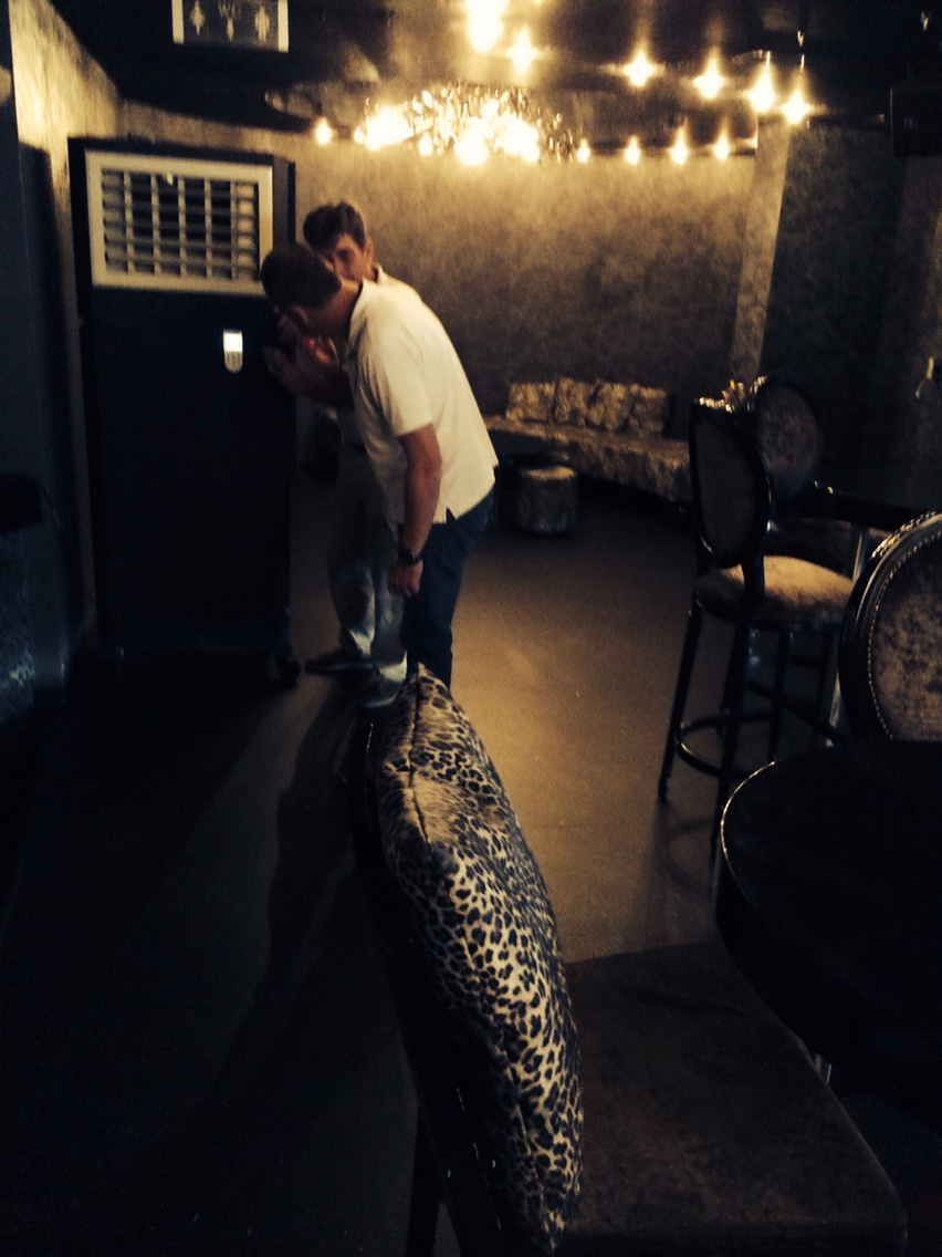 Customer requested a save energy cooling solution to operate also with open doors and windows. Solution: installation of two portable cooling units concealed with gypso board painted black. Electricity consumption 1 euro per 10 hr operation!