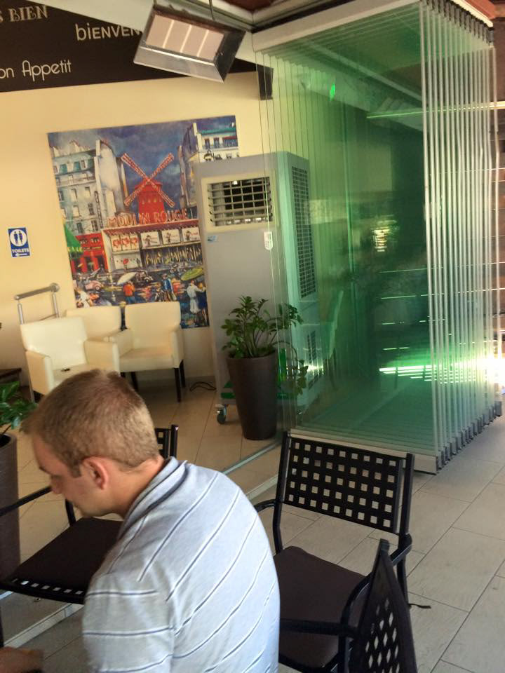PROJECT: Cafeteria outdoor sitting area CUSTOMER: Requested a save energy super cold airflow cooling solution SOLUTION: Installation COOLAIR500 compressor water cooled model.