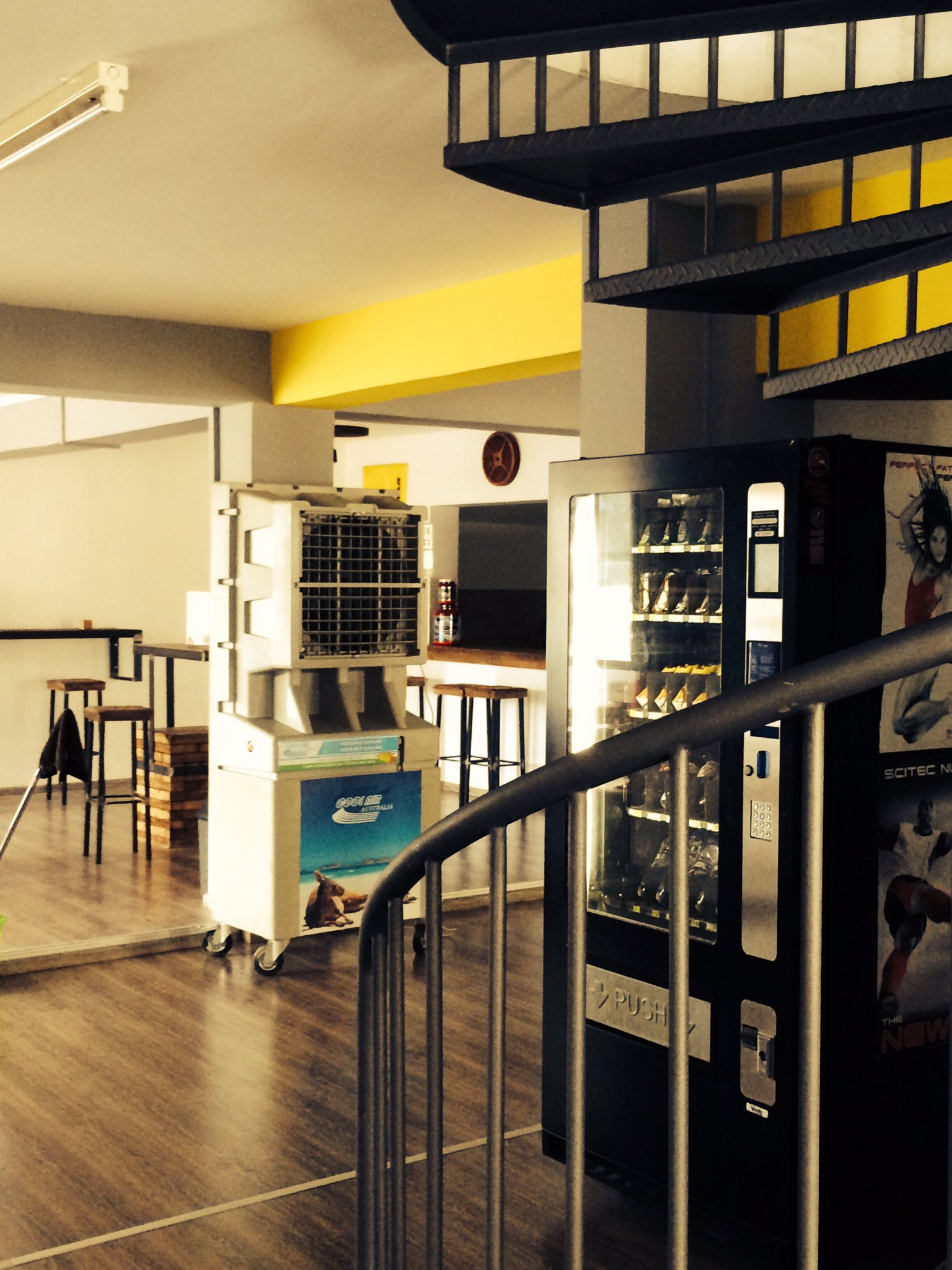 Gym owner requested a save energy natural ventilation and cooling solution for his gym, solution installation of two portable chillers 42,000 BTU for fresh air and cooling