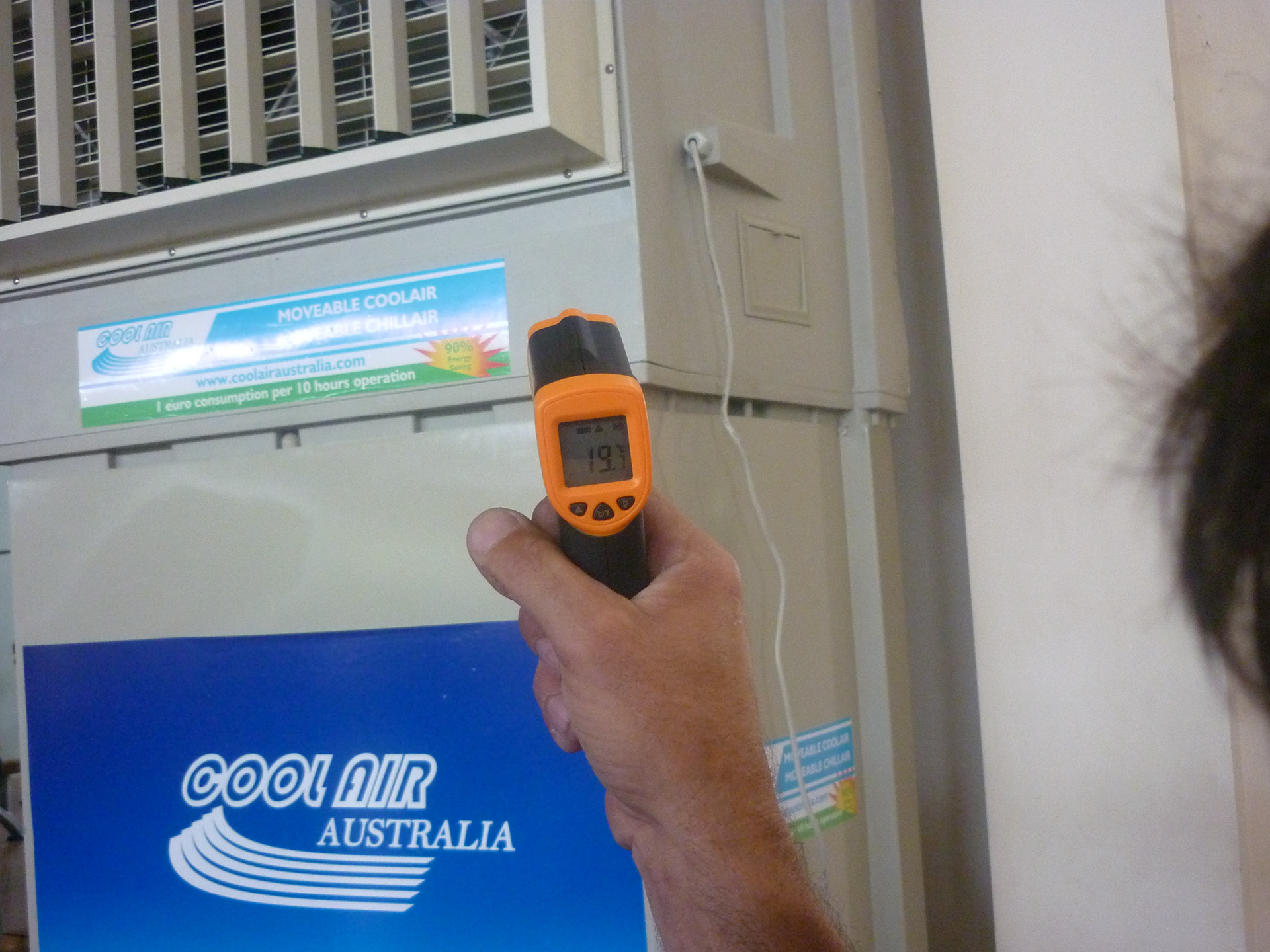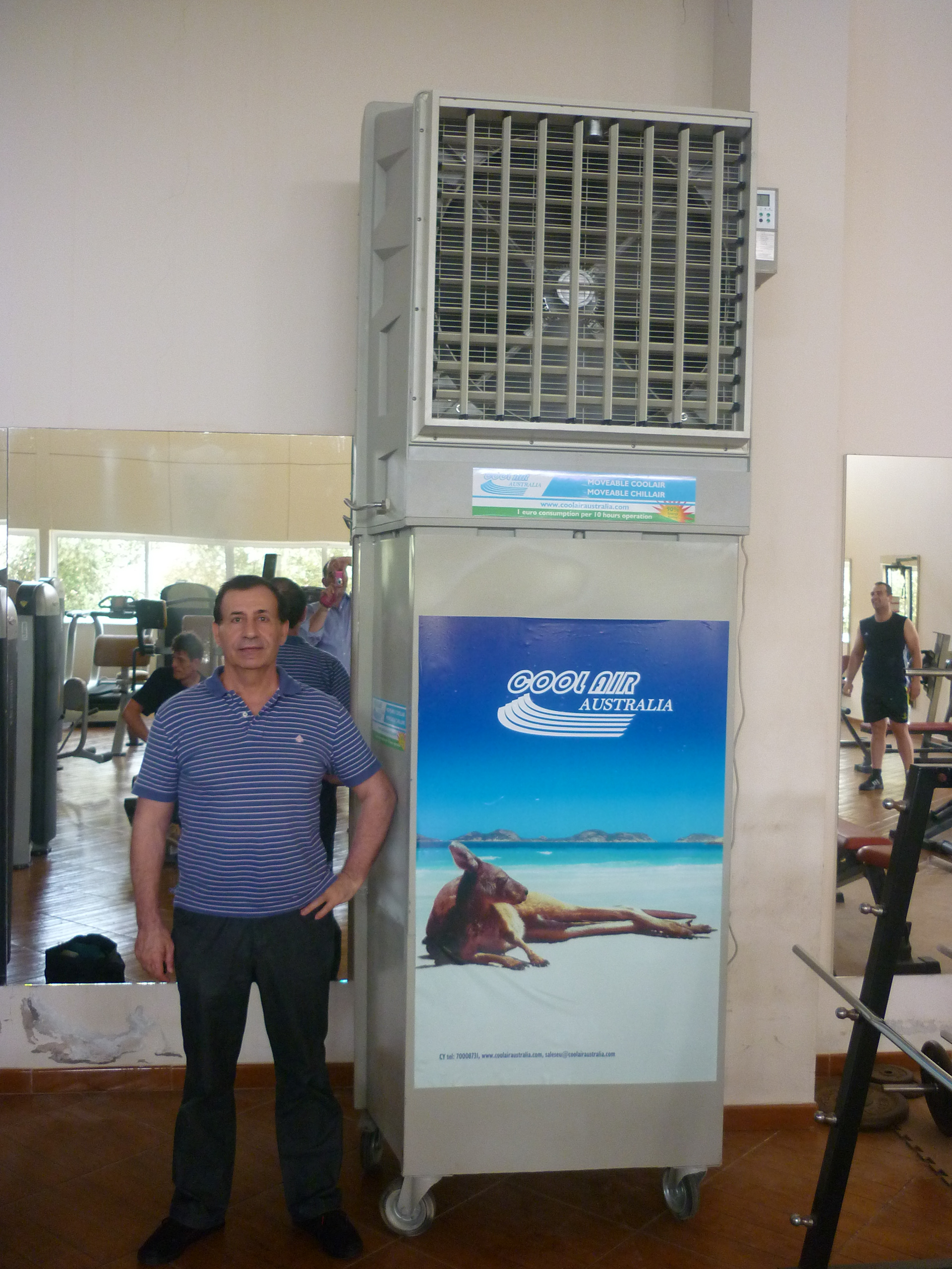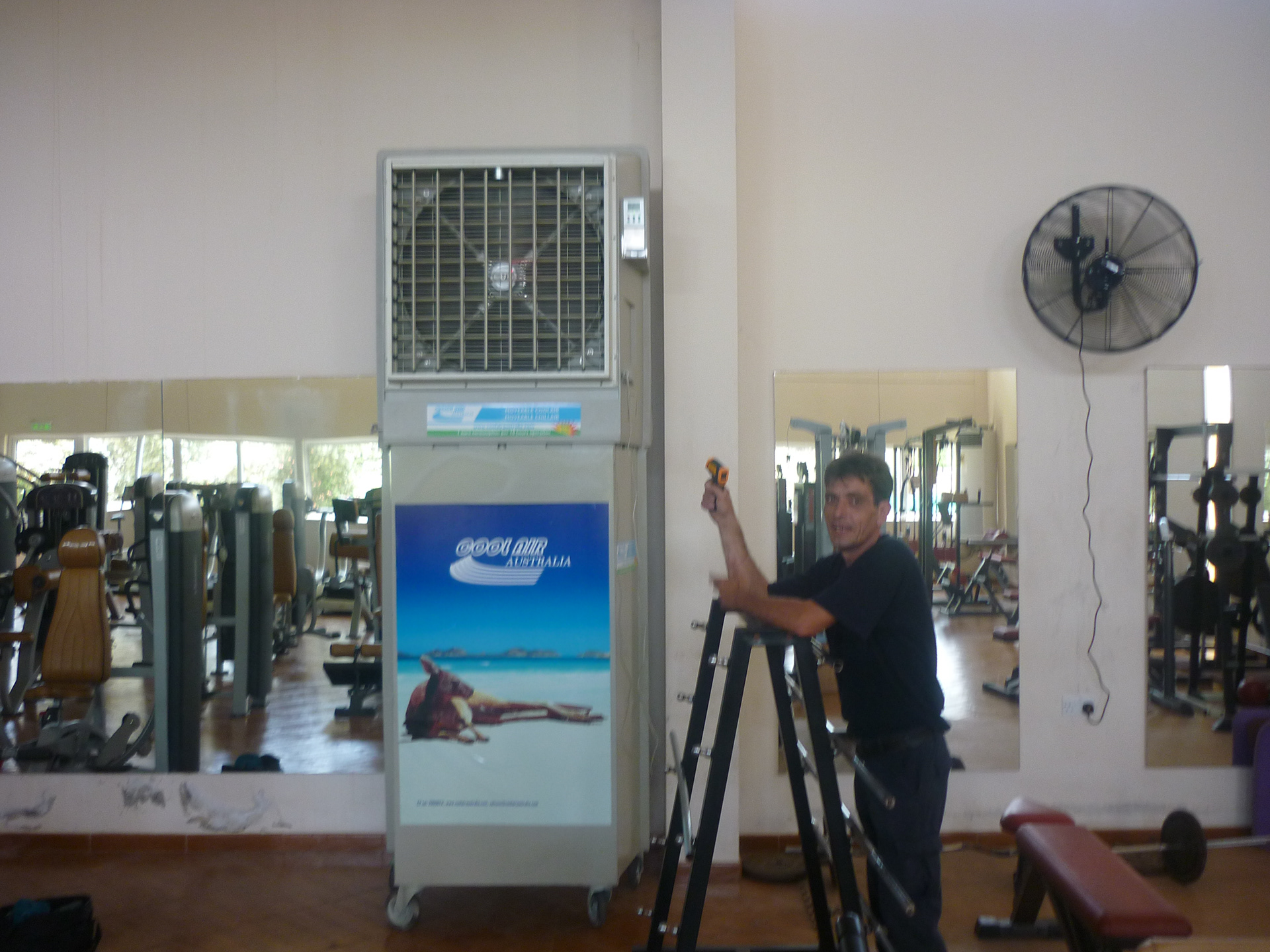 PROJECT: Gym & Spa owner too frustrated to use again this summer his already installed air conditioners because of excessive electricity consumption. CUSTOMER: Requested a save energy cooling solution for the weight lifting room 250 SQM w/ 7 meters ceiling height. SOLUTION: Installation of portable chiller and 3 industrial wall fans to provide air stratification because of 7 meters ceiling height Why portable chiller air conditioning? Delivers 100% fresh air Uses up to 80% less electricity than comparable refrigerated systems! Windows and doors can be left open Greatly reduces costs of staying cool Enables lower purchase and installation costs Guarantees fresh, natural, healthy “lifestyle” cooling Allergy free, asthma-safe environment* Replaces all of the air approximately every two minutes Ensures full ventilation – drives out odours and stale air Never dries out the eyes and skin, or even indoor plants
