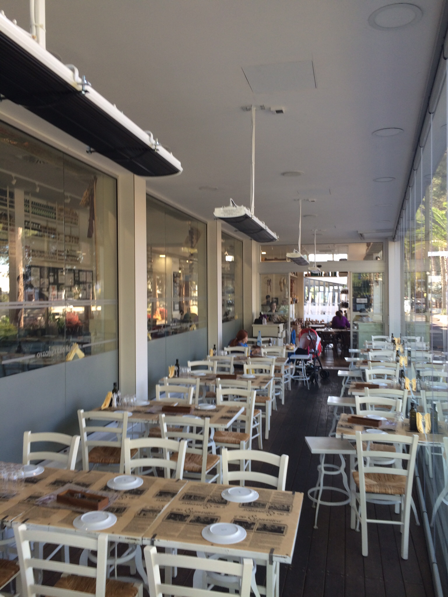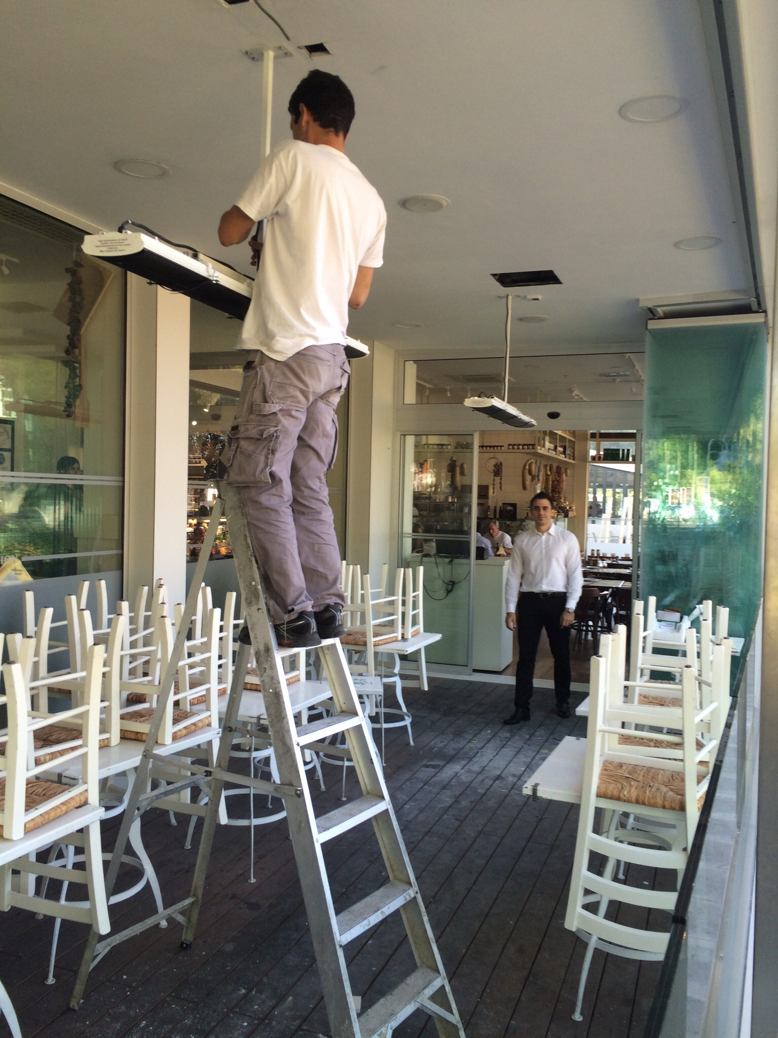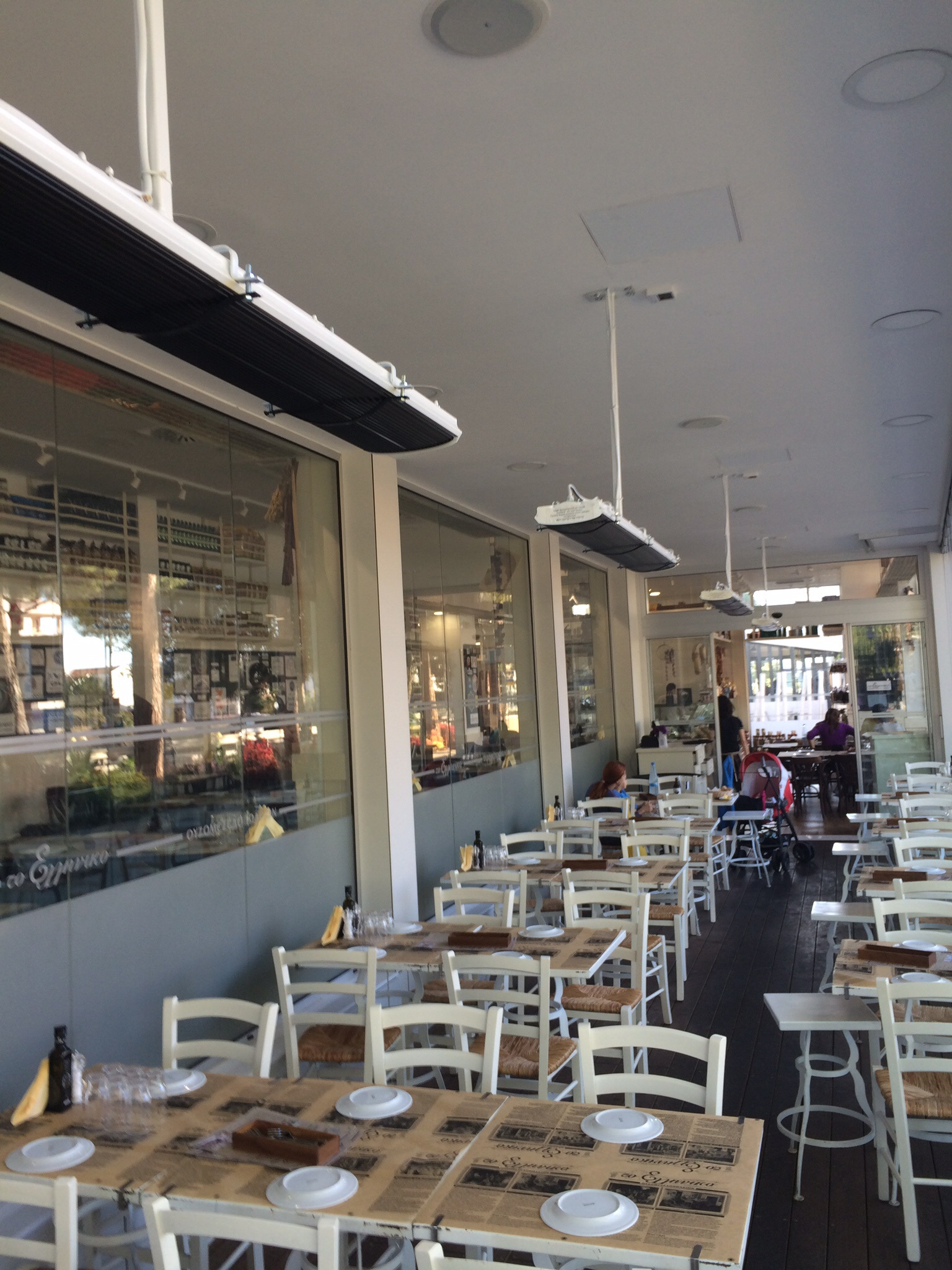 No emit light, white slim size radiant heating solution for restaurants outdoor covered dinning area.