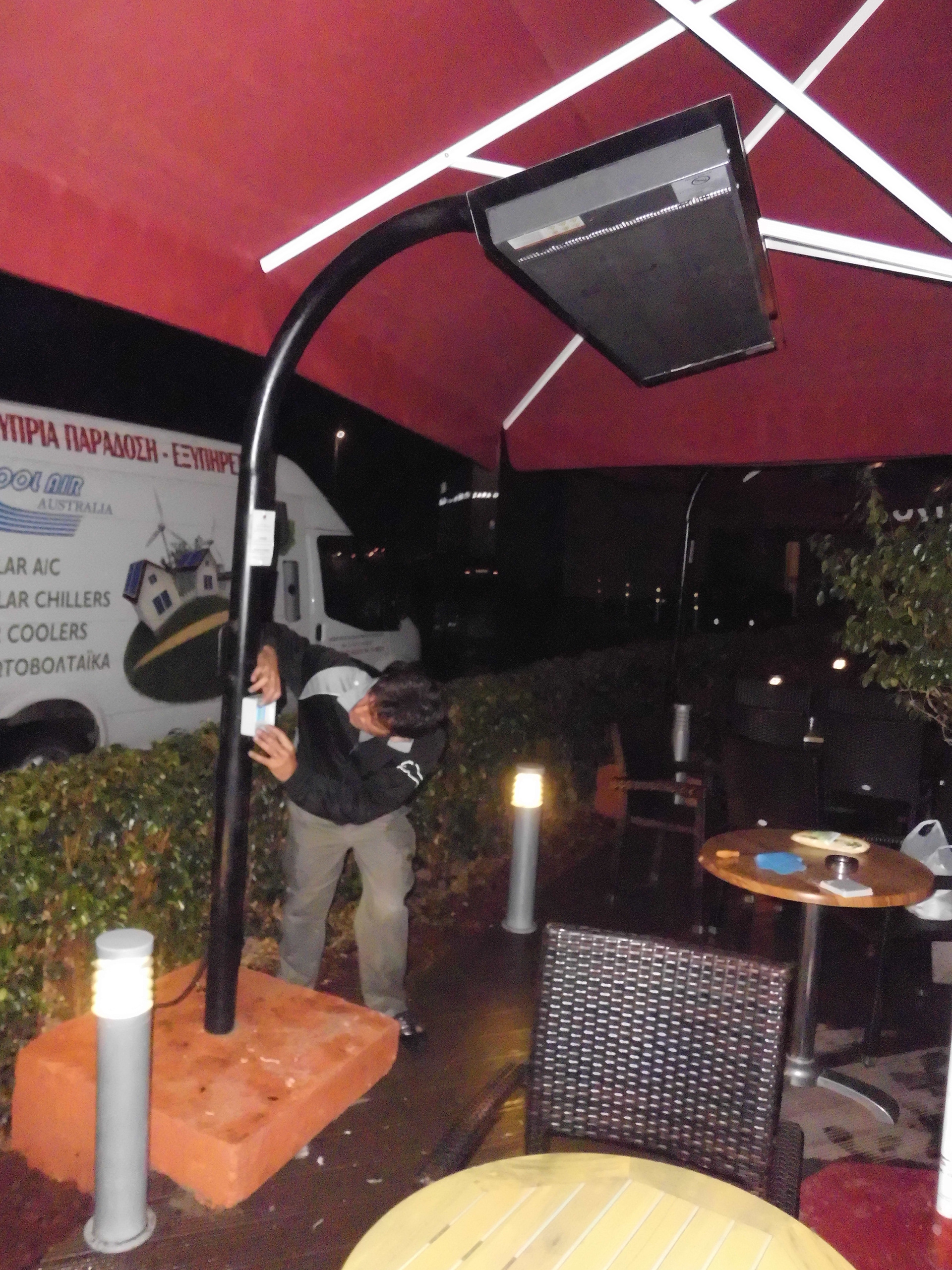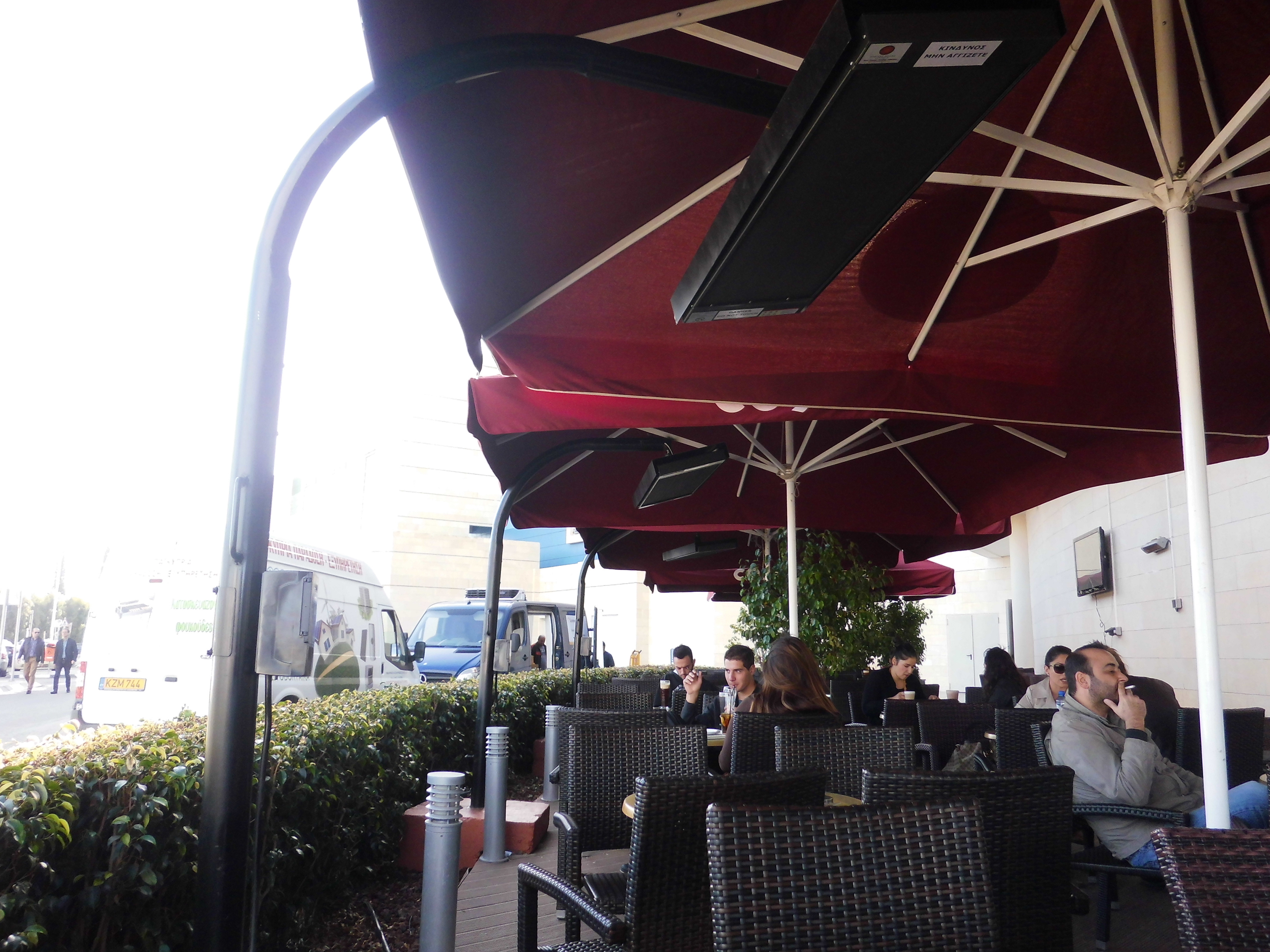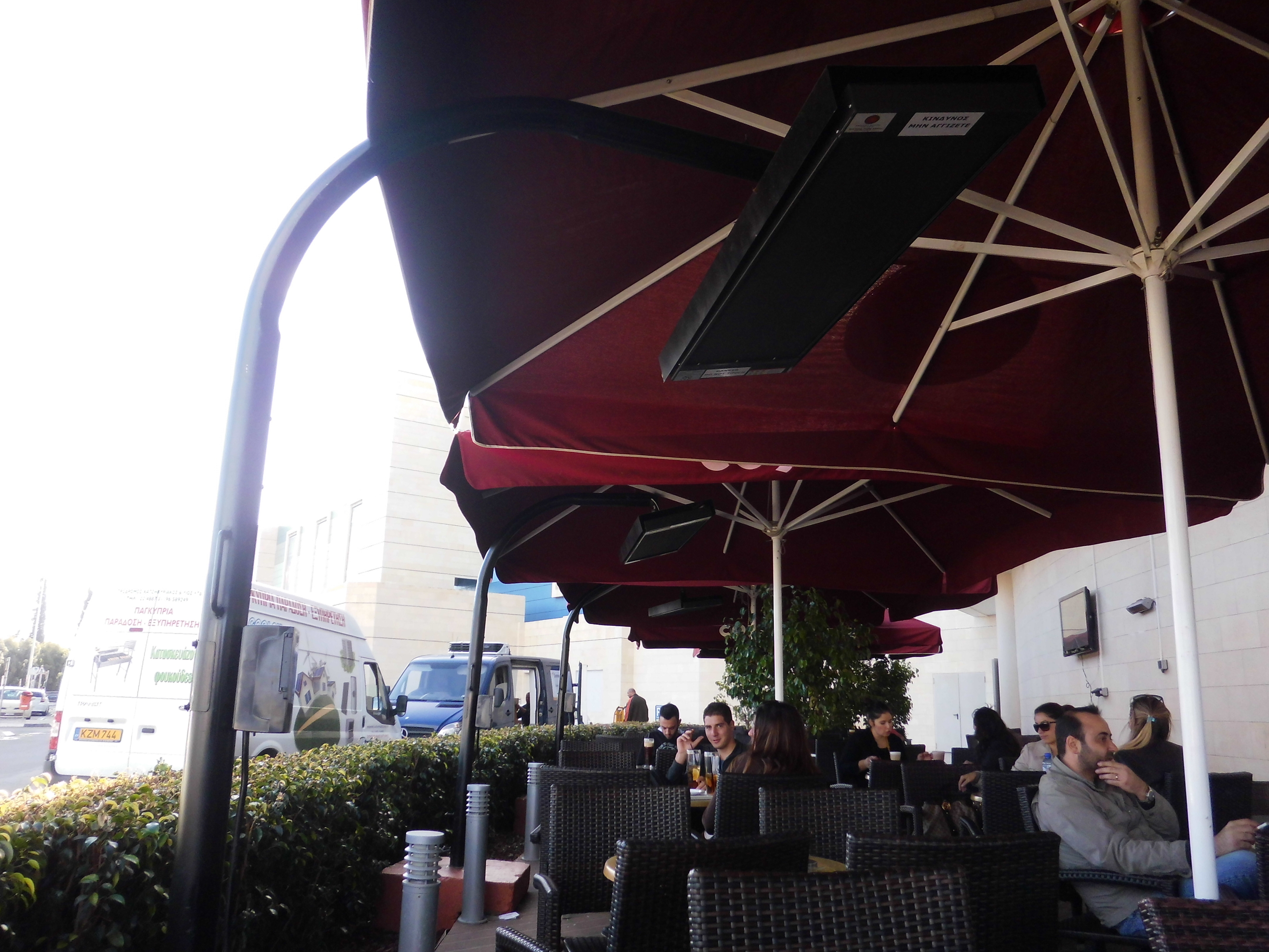 PROJECT: outdoor area MY MALL Limasol CUSTOMER: requested a type of save energy heating device that will reduce electricity bill on heating and also enable cafeteria employees to close outdoor patio ombrellas when too much wind. SOLUTION: Installation 4 commercial radiant heater panels 4.0kw each on special custom made floor bases that can be spin 360 degrees to its self and enable employyes to close the ombrellas.