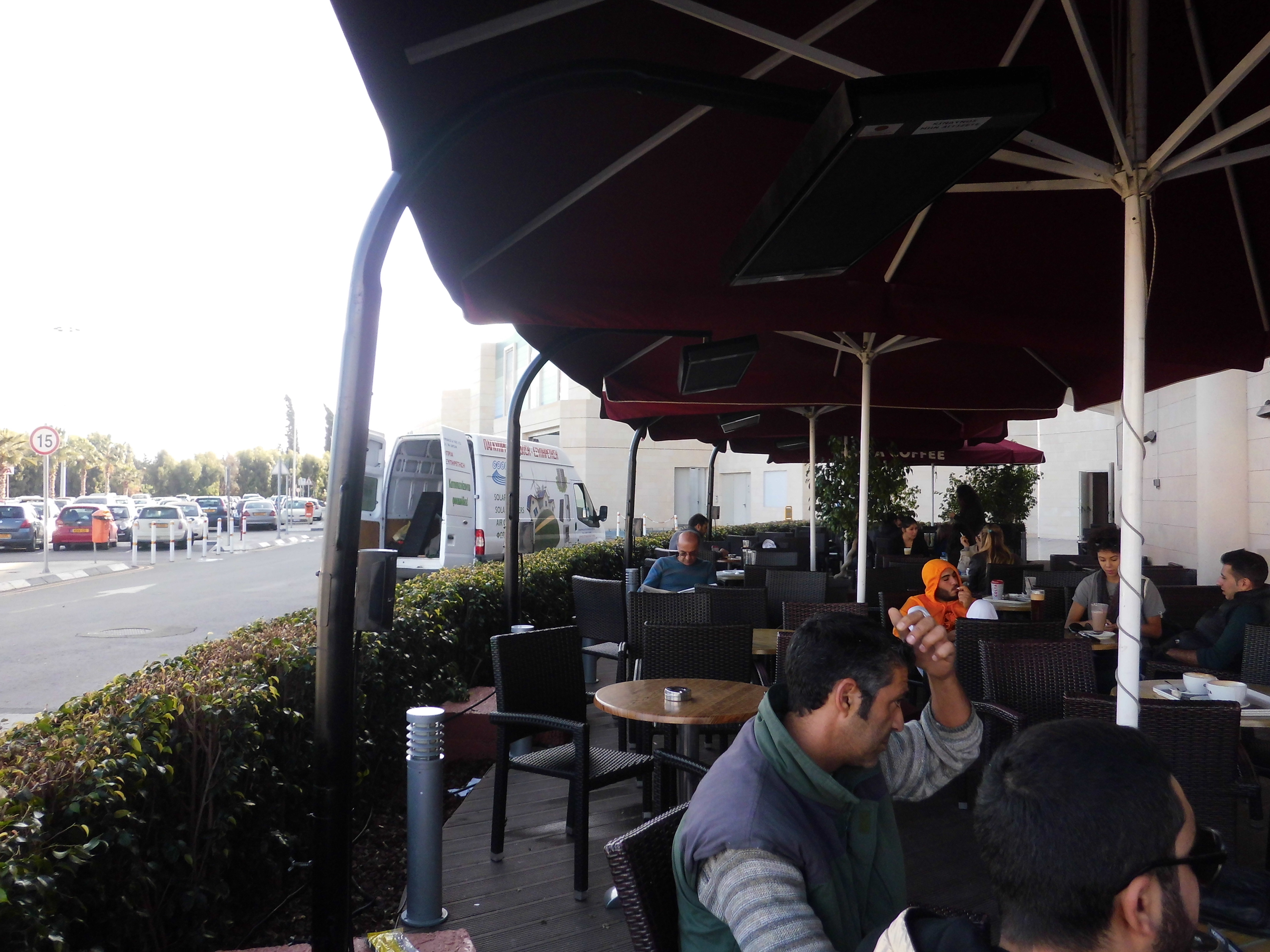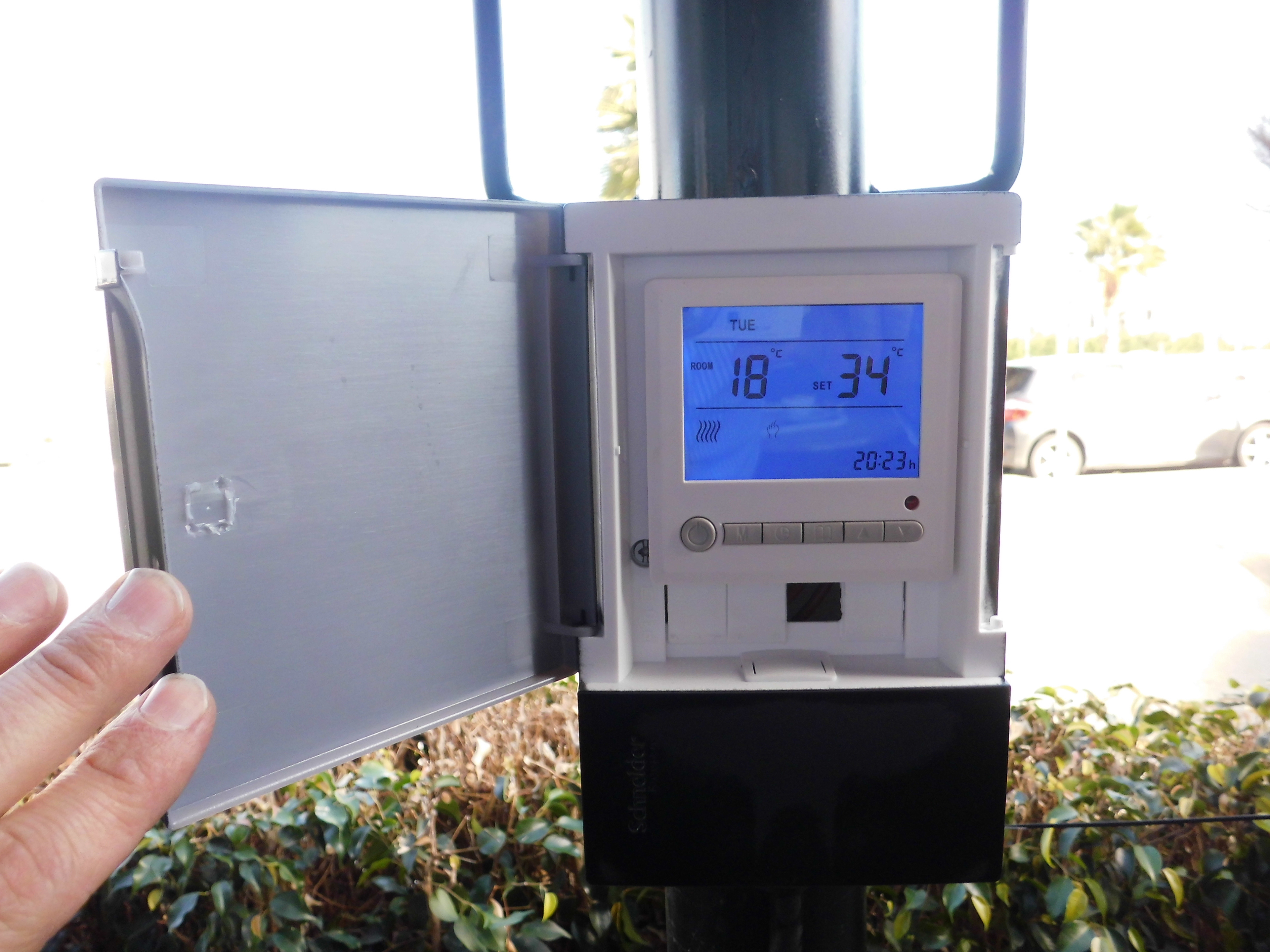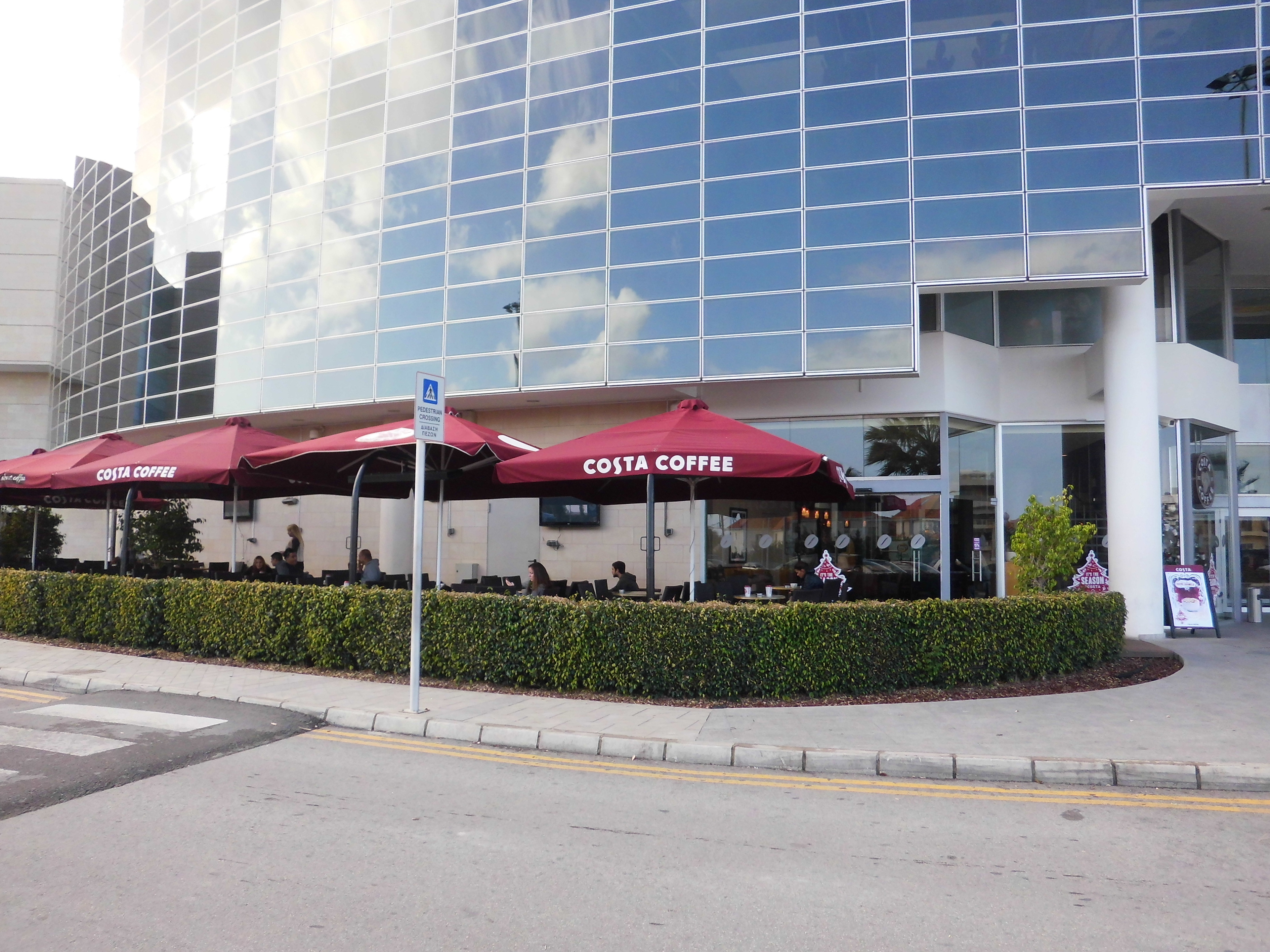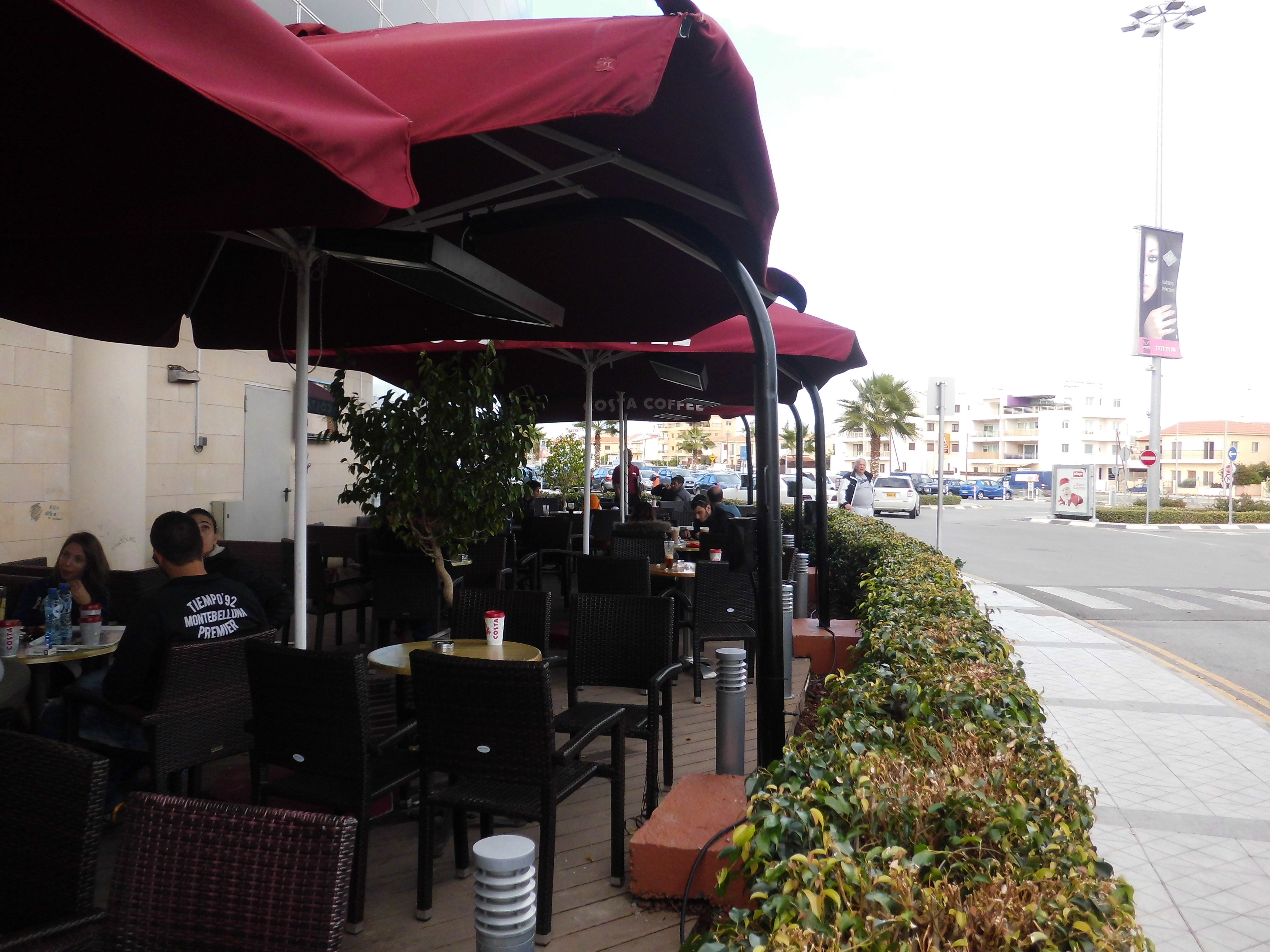 PROJECT: outdoor area MY MALL Limasol CUSTOMER: requested a type of save energy heating device that will reduce electricity bill on heating and also enable cafeteria employees to close outdoor patio ombrellas when too much wind. SOLUTION: Installation 4 commercial radiant heater panels 4.0kw each on special custom made floor bases that can be spin 360 degrees to its self and enable employyes to close the ombrellas.