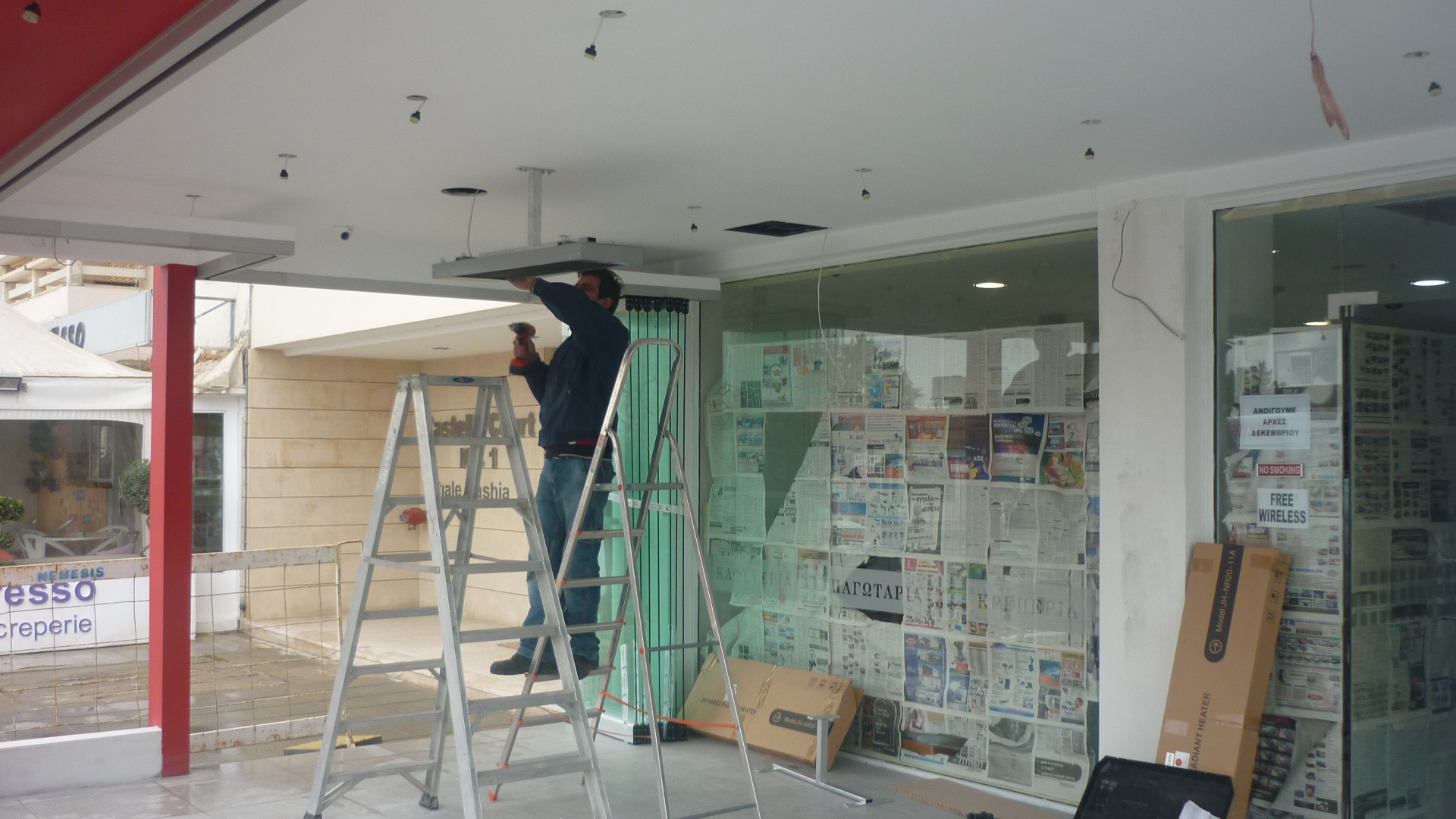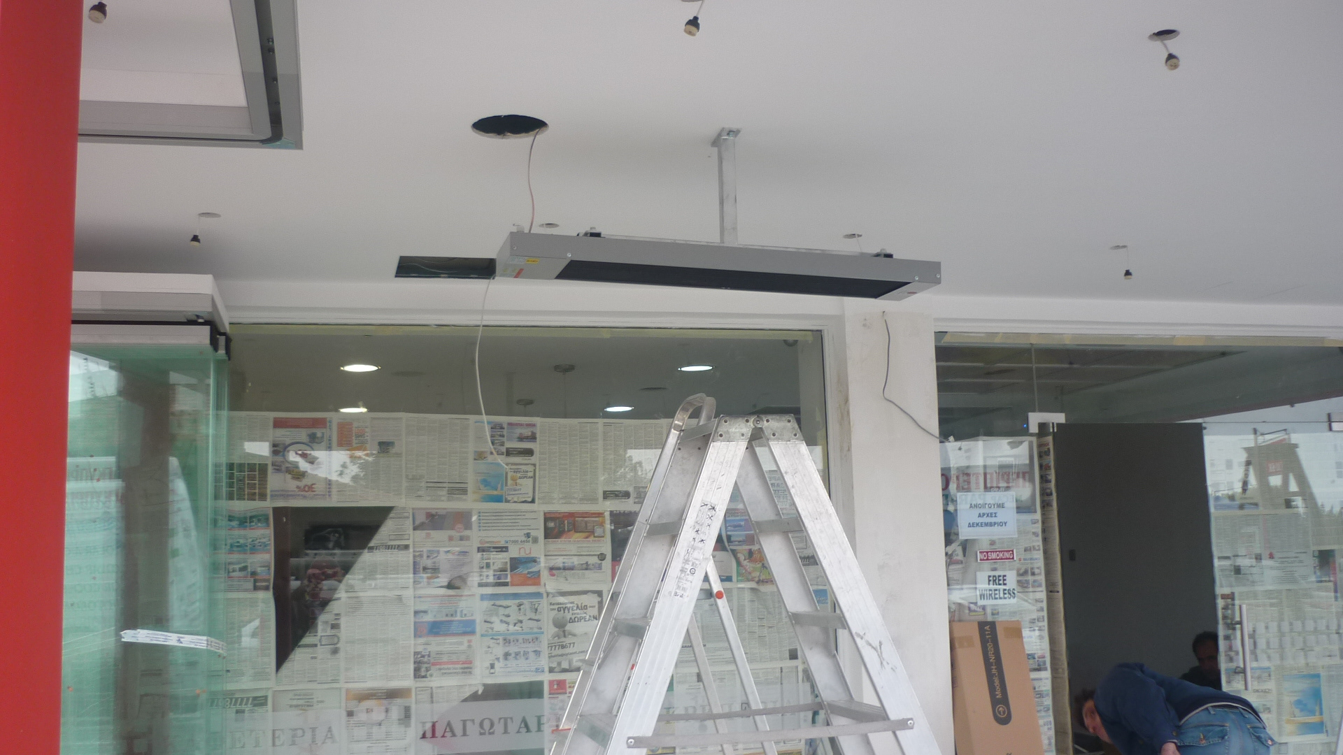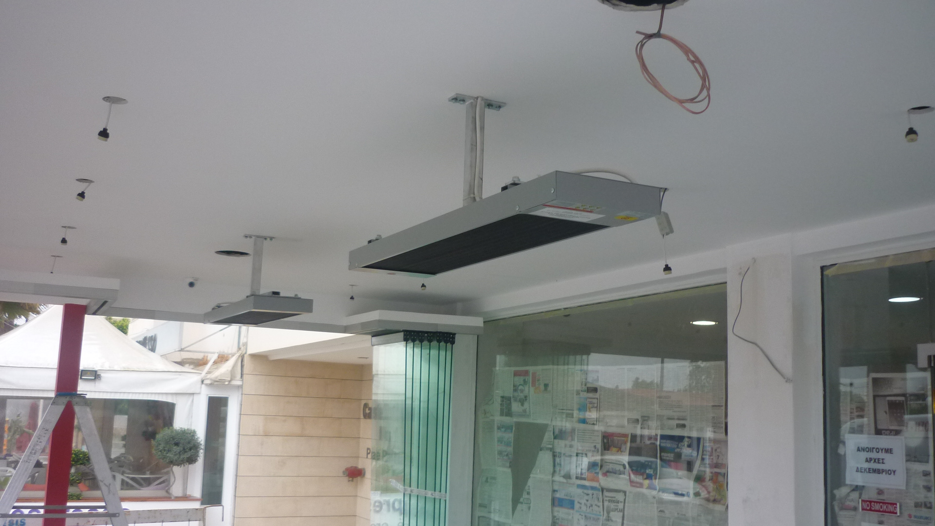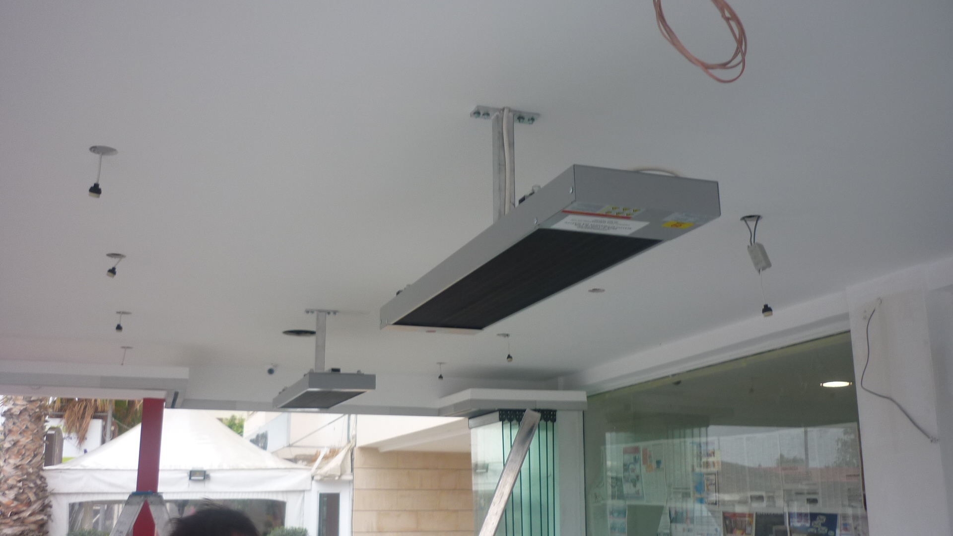 PROJECT: Outdoor covered area of new gelateria CUSTOMER: Requested a save energy ehating solution not no emmit any light during operation. SOLUTION: Installation of two one phase commercial radiant heaters