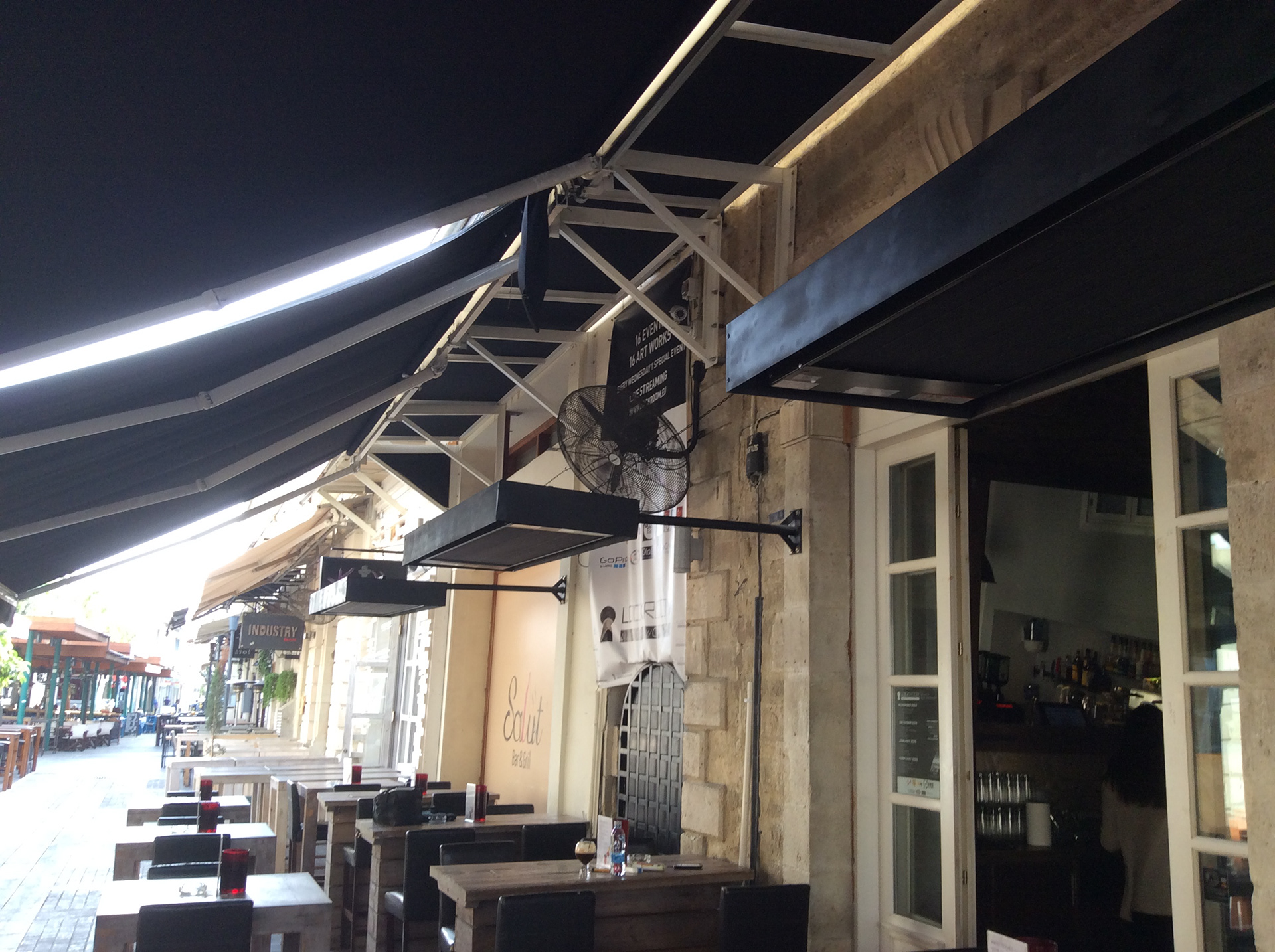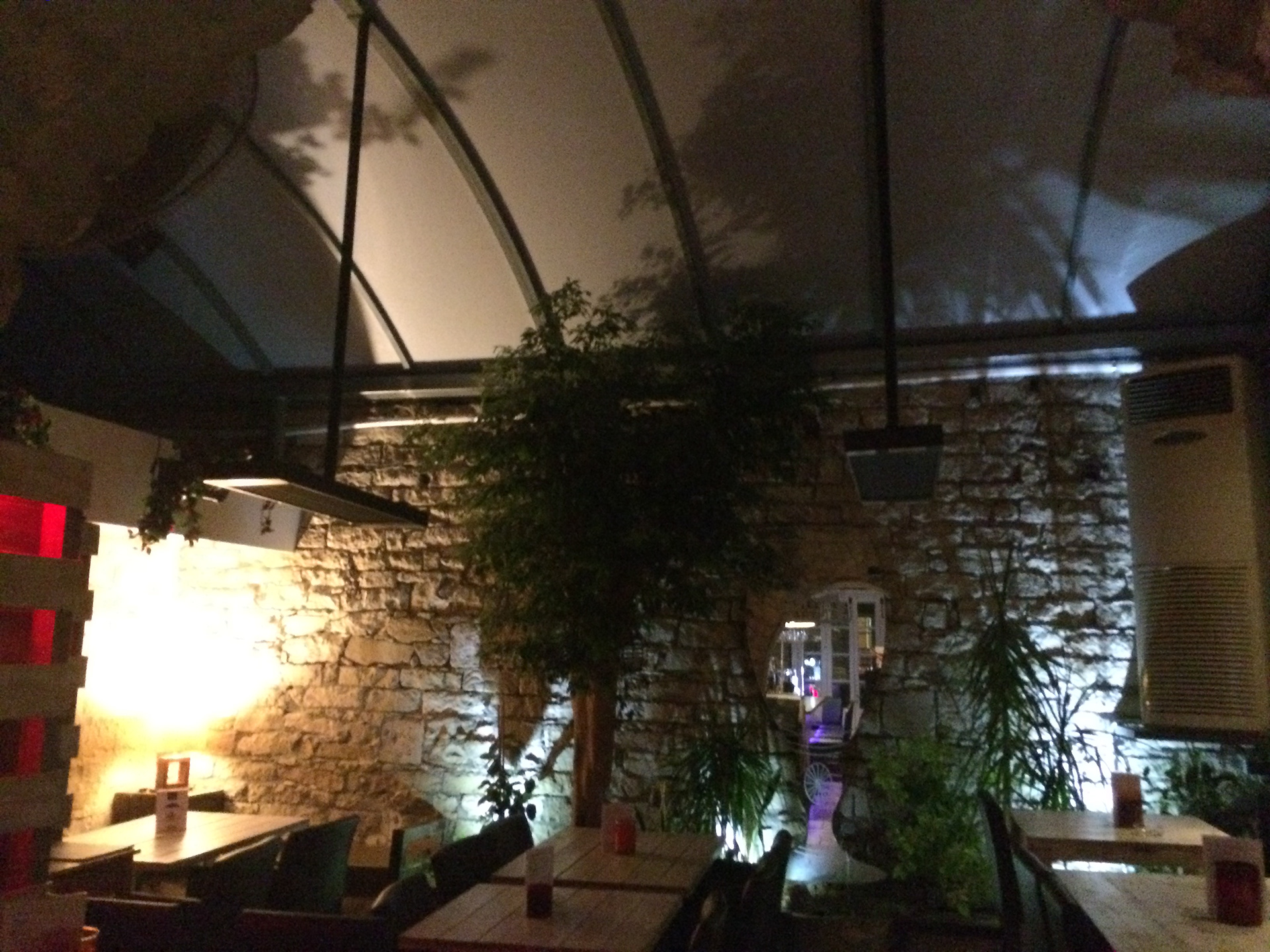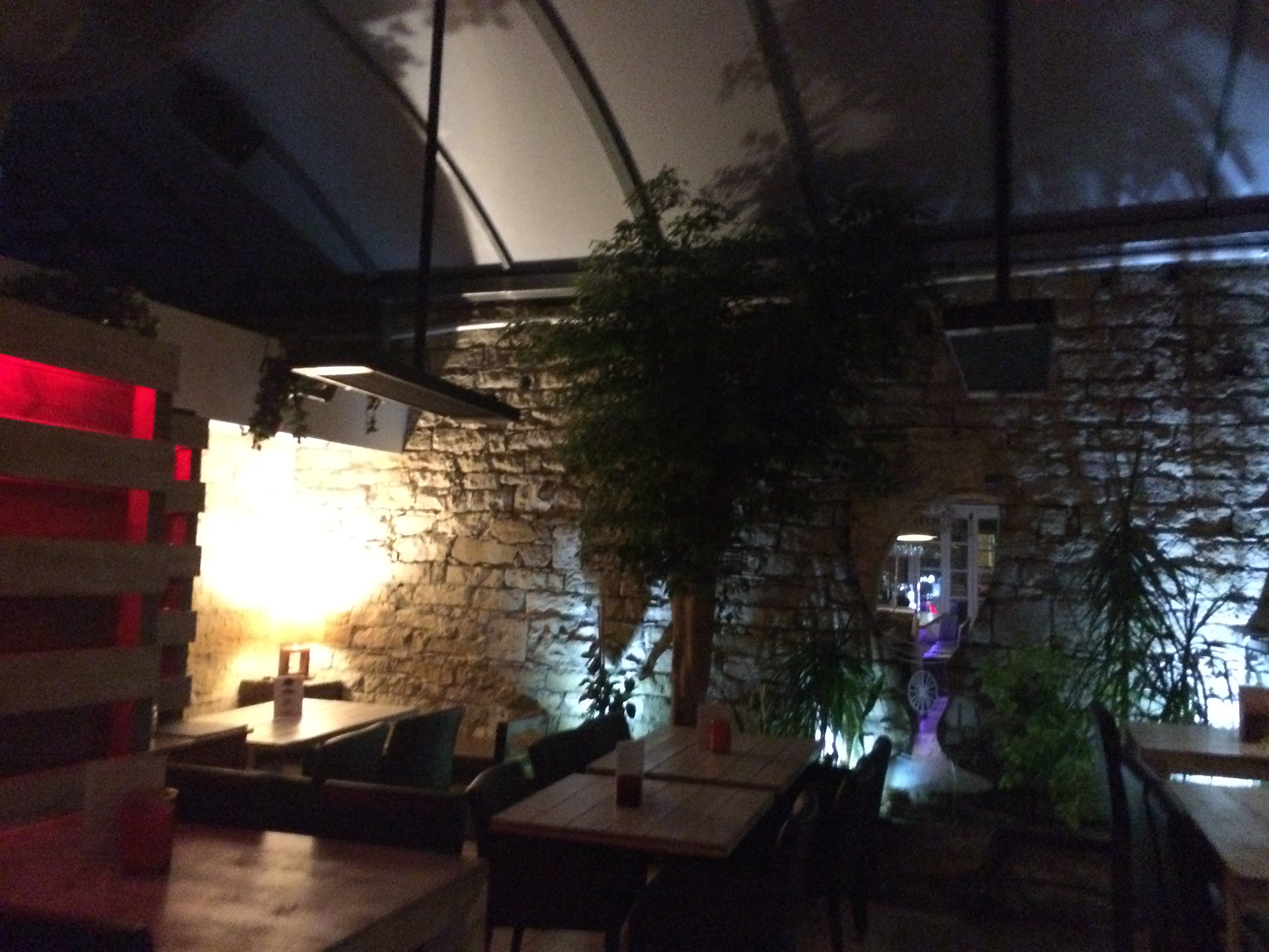 Project: Outdoor tent cover restaurant's patio Customer: Requested a save energy heating solution that will not emmit any light during operation. Solution: Installation of 3 3phase commercial radiant heater panels & 2 1phase commercial heaters