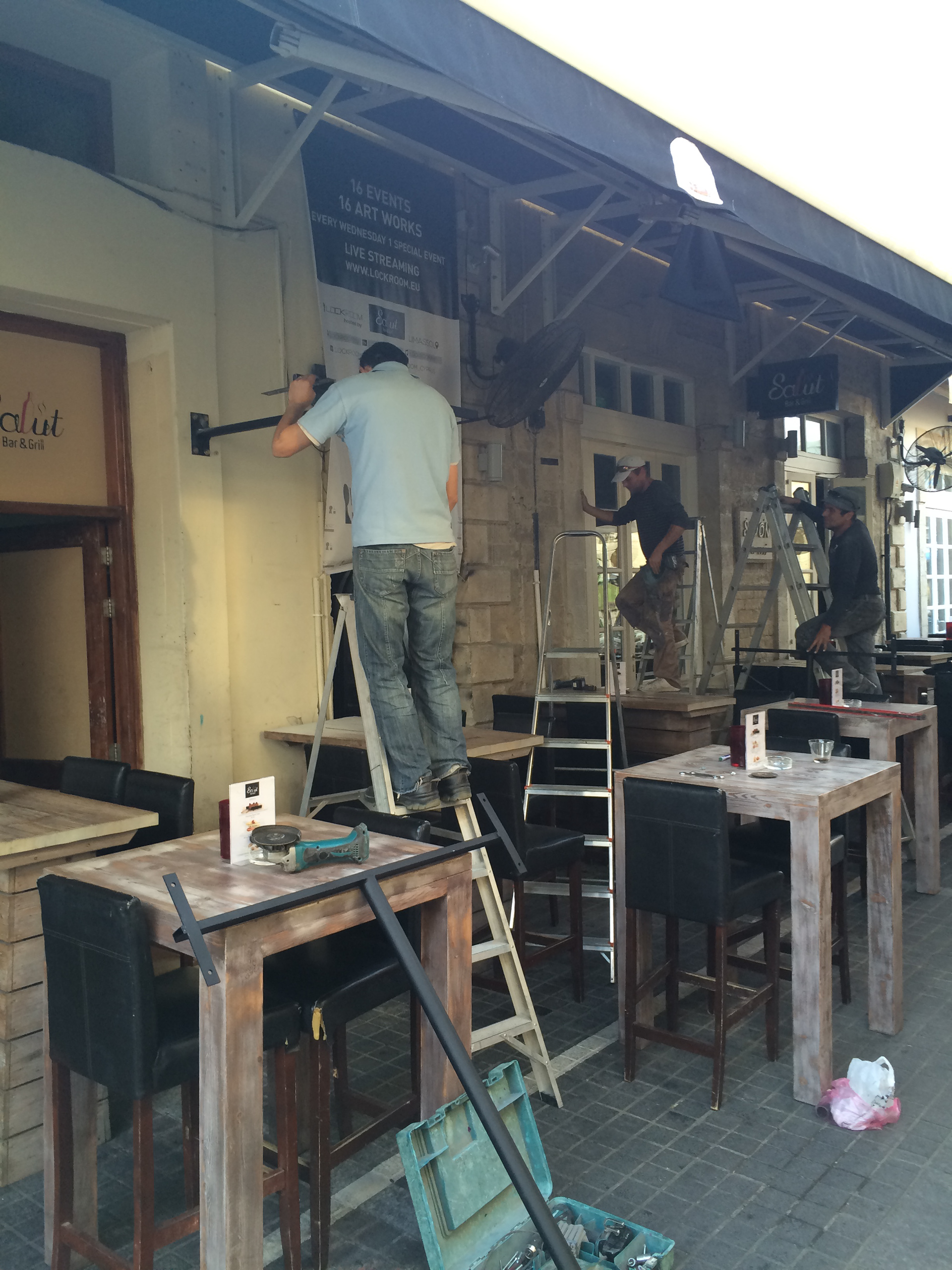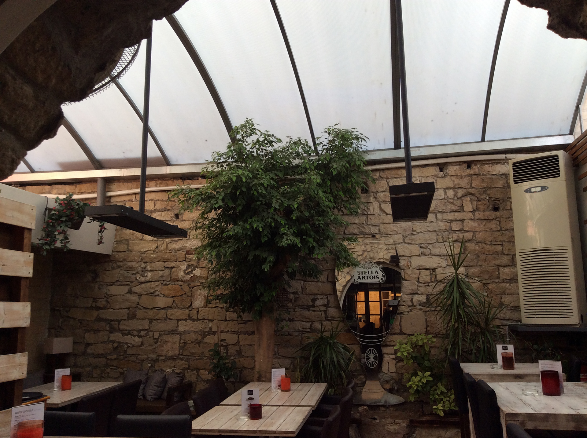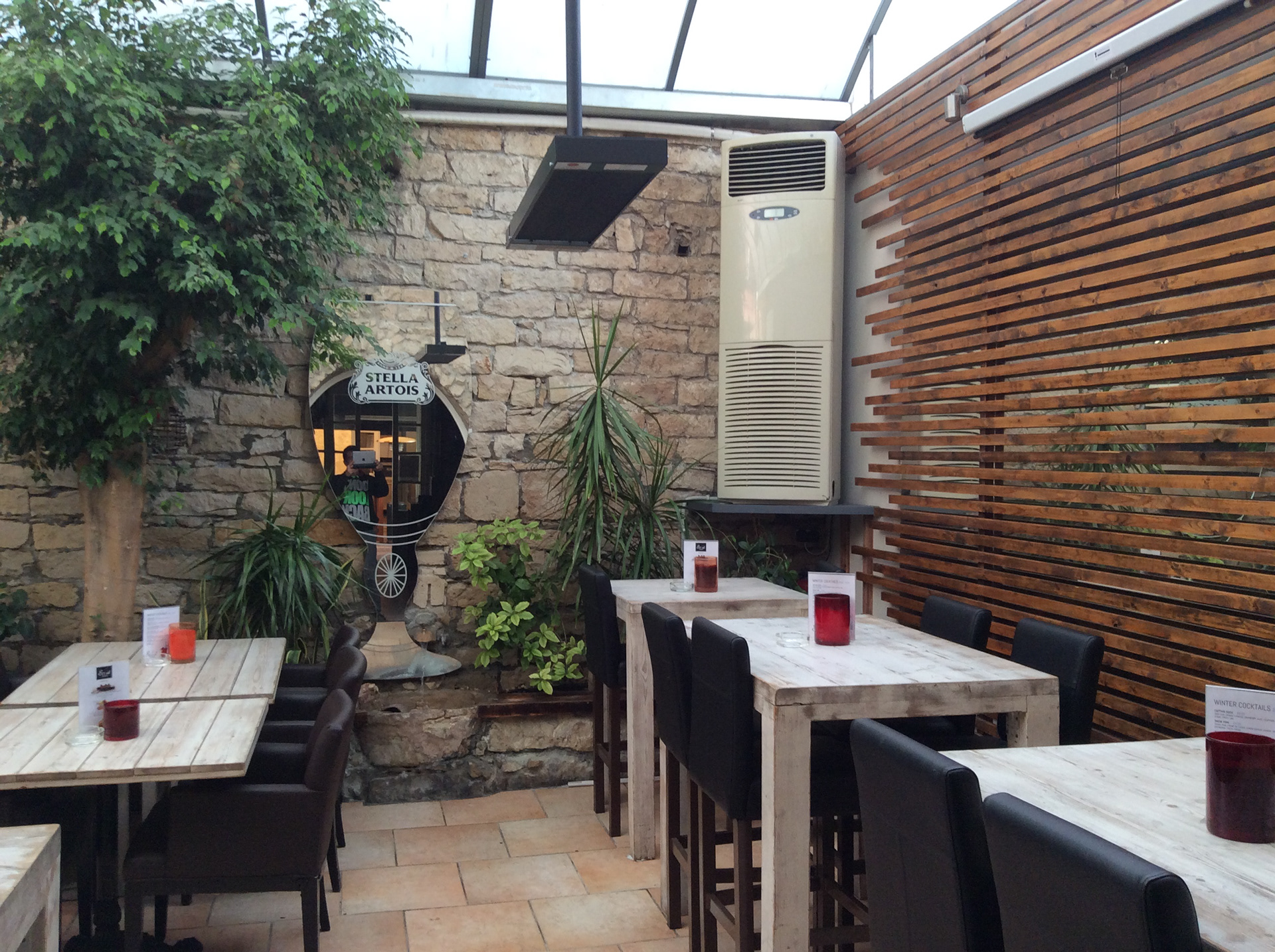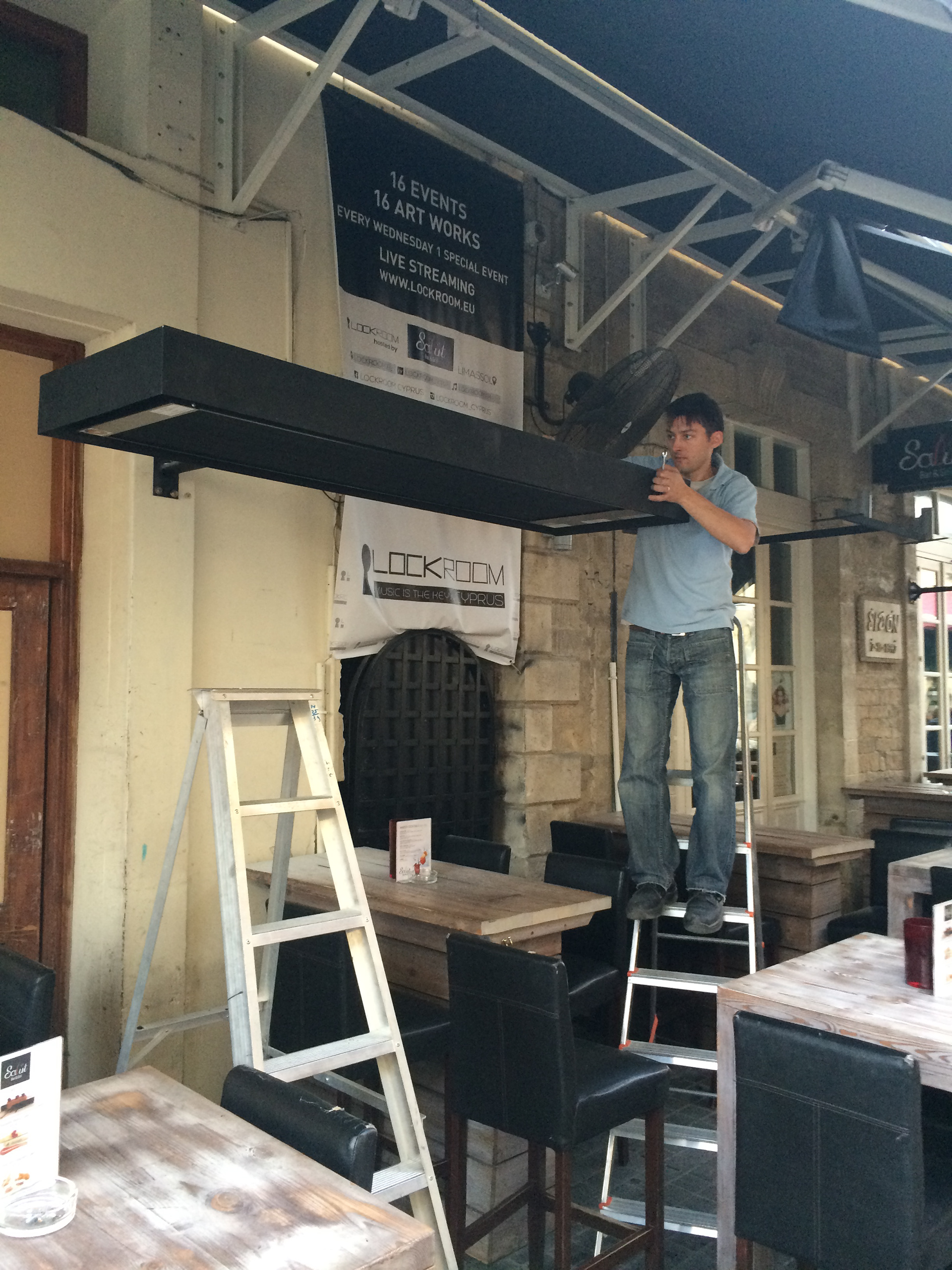 Project: Outdoor tent cover restaurant's patio Customer: Requested a save energy heating solution that will not emmit any light during operation. Solution: Installation of 3 3phase commercial radiant heater panels & 2 1phase commercial heaters