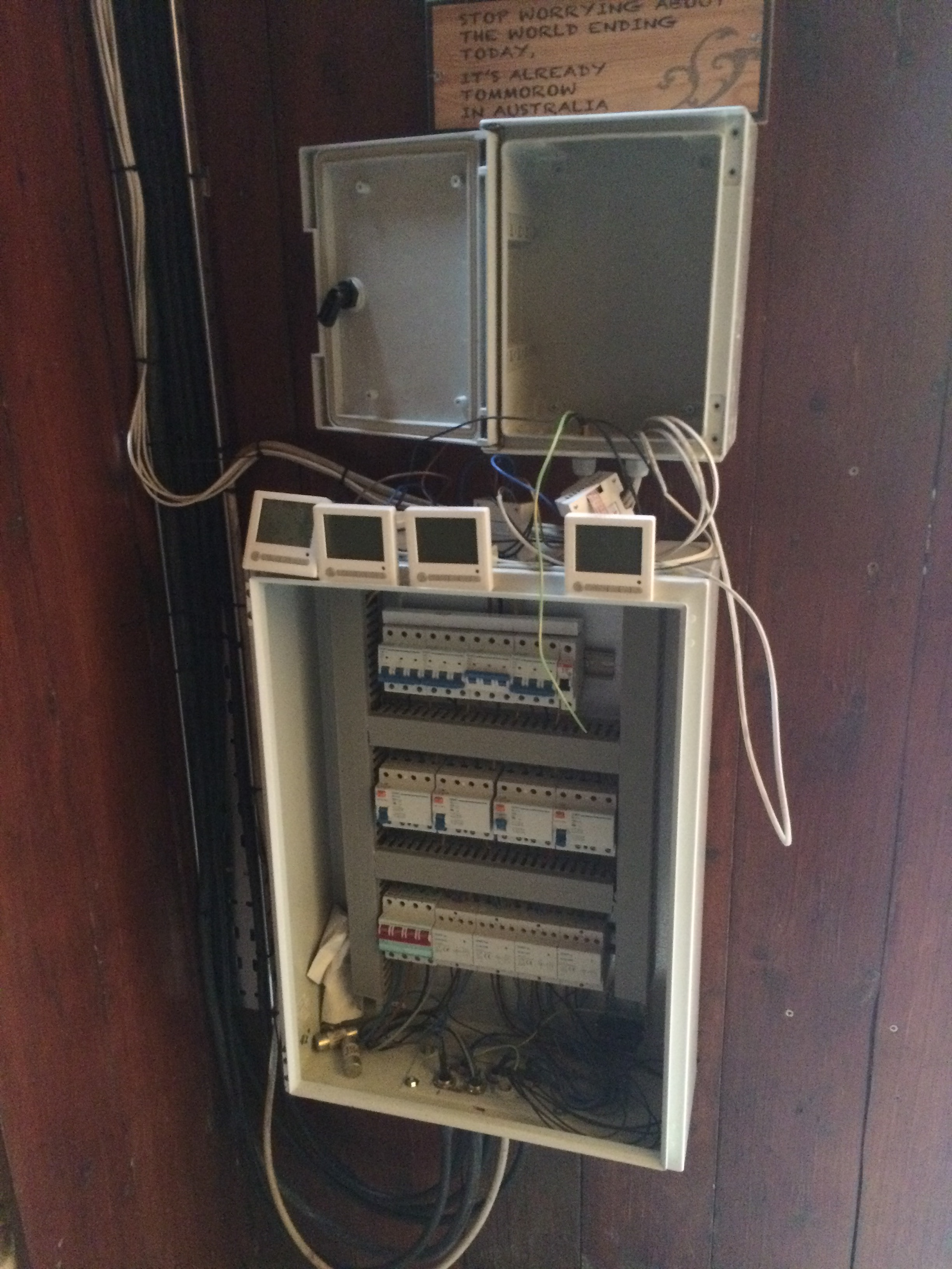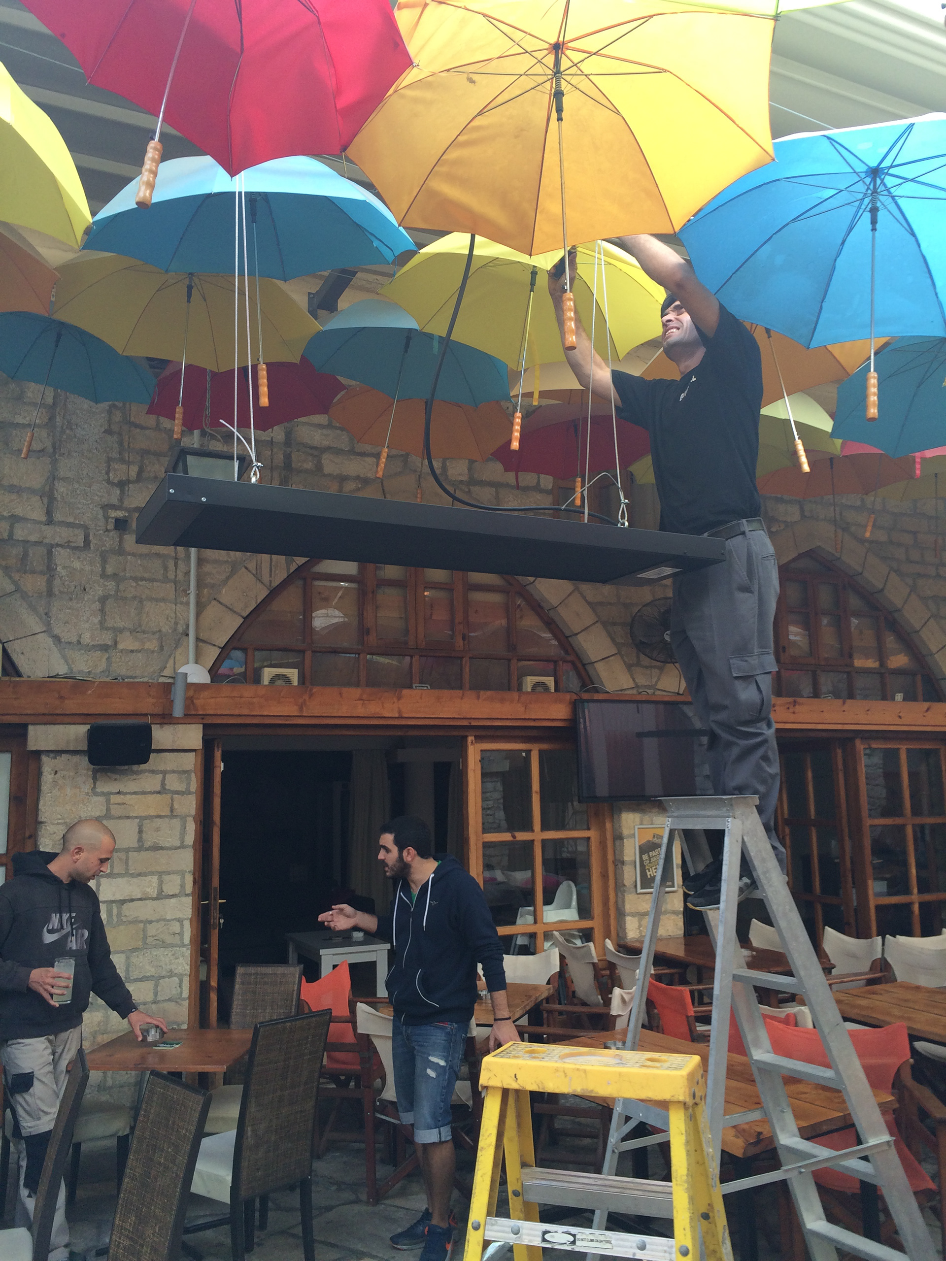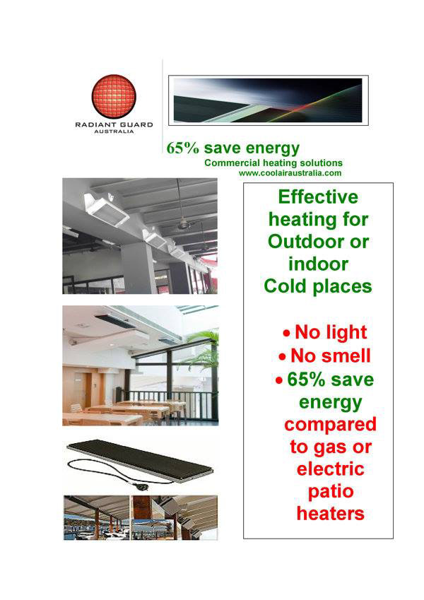 PROJECT: outdoor covered cafeteria area. CUSTOMER: Requested a save energy solution for heating that will not emit any light and produce very good heating result. SOLUTION: 4 commercial radiant heaters installation