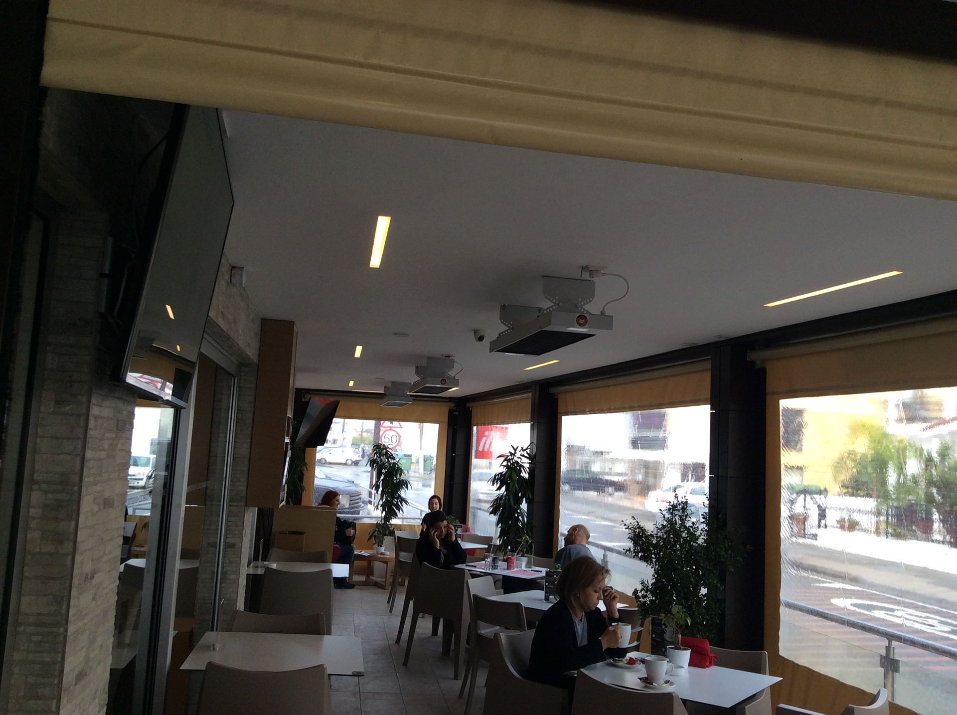 Project: restaurant's outdoor patio heating Customer: Requested a save energy heating solution Solution: Installation of 5 1phase radinat heating panels