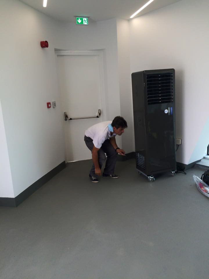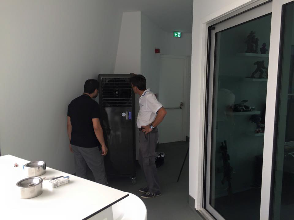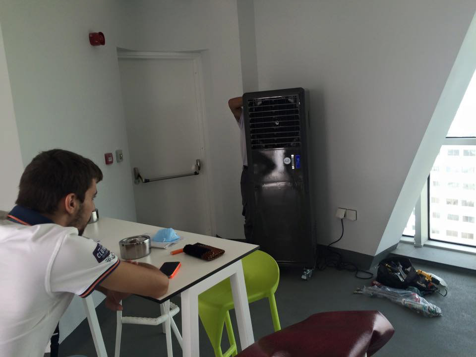 PROJECT: Tower's balconies outdoor cooling solution CUSTOMER: Requested a quiet, super cold airflow, save energy cooling solution. SOLUTION: COOLAIR300 compresor water cooled models