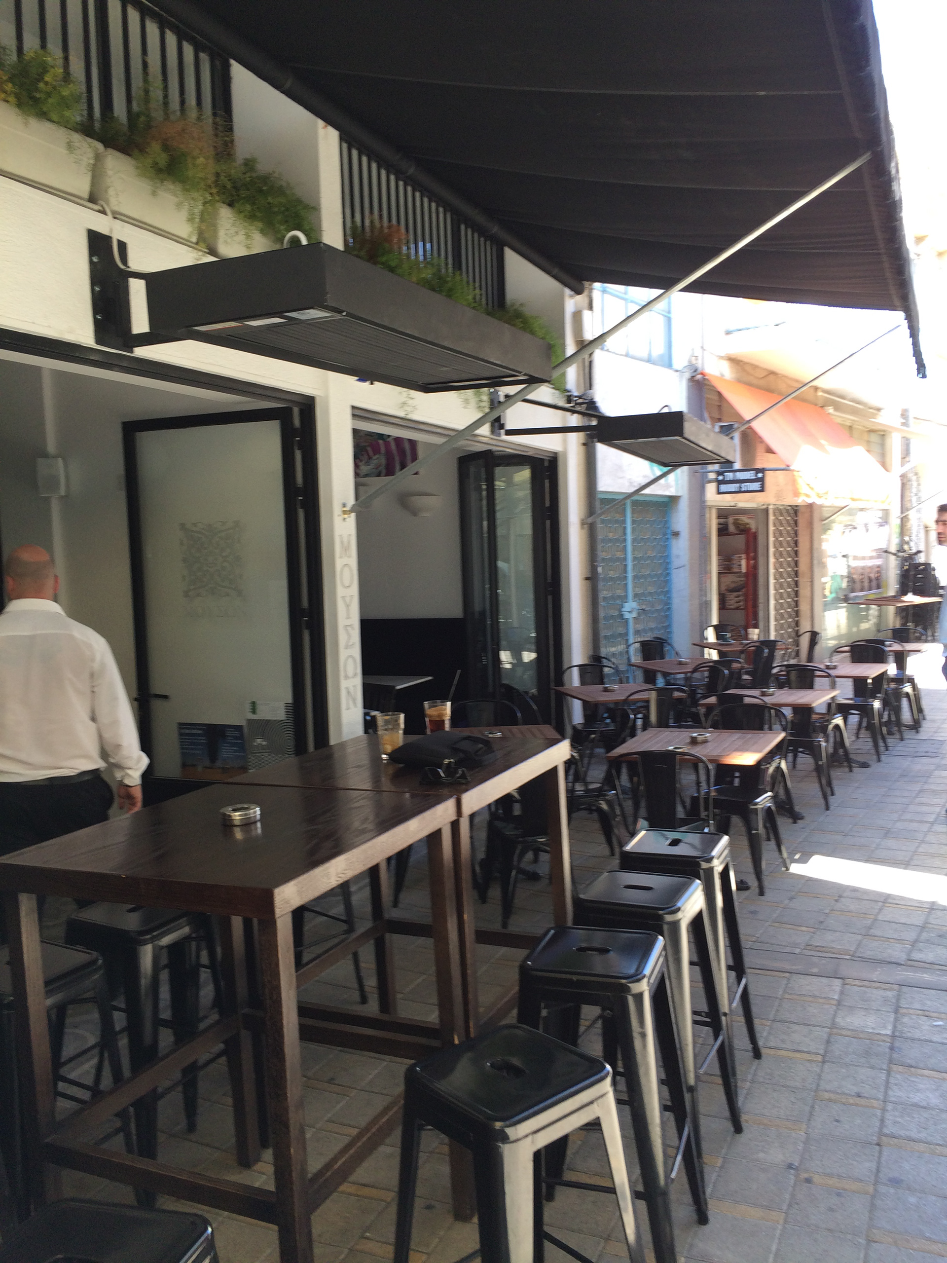 Project: Outdoor covered area of wine bar Customer: requested a save energy, efficient, minimal style outdoor heating solution Solution: Installation of two commercial radiant heaters
