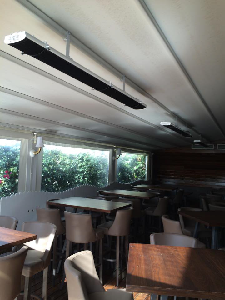 PROJECT: Wine Bar outdoor covered patio heating solution CUSTOMER: Requested a save energy no emit light heating solution to replace wall gas heaters SOLUTION: Installation smart radiant heaters wiFi controled operation